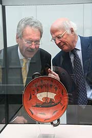 ![]() Ludwig Kaminski, Direktor Alexander S. Onassis Public Benefit Foundation und Prof. Dr. Wünsche, Direktor der Antikensammlung und Glyptothek München vor der Trinkschale des Exekias ![]() ![]() ![]() ![]() Claudia Burckhardt und Götz Argus interpretierten die antike Geschichte ![]() Fotos: Martin Schmitz |