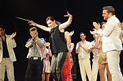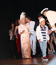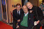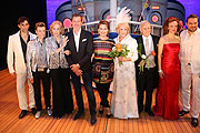 Das Paar, das die ganze Chose ins Rollen bringt, wird von Gunter Sonneson (auch er ein IWNNINY-Wiederholungstäter) als Otto und - nur im Oktober - von Alice und Ellen Kessler gespielt. Die Kessler-Zwillinge teilen sich -wie praktisch - den anspruchsvollen Part der Maria. „Alice hatte die Berliner Premiere gespielt, ich durfte in München am Eröffnungsabend auftreten“, so Ellen Kessler (78). Schwester Alice verfolgte die Show aus den Kulissen heraus und überreichte ihrer Schwester - nette Geste - das Premieren-Sträußchen. Großer Applaus auch für den Kleinsten der Mitwirkenden: Nahuel gibt den coolen, rappenden Enkel Florian wie ein alter Bühnen-Hase. Rasante Choreographien, aufwändige Ausstattung, prächtige Kostüme, viele Projektionsbilder und ein spielfreudiges Ensemble (bei dem der Tonmann am Premierenabend aber seine liebe Not hatte) sorgen für Entertainment, das süchtig macht. Wer die Aufführung aus den long-run-Städten wie Hamburg, Stuttgart oder Wien kennt, vermisst freilich das spektakuläre Schiff, das im Laufe des Abends von der linken Seite einmal quer über die Showbühne fuhr und auf geheimnisvolle Weise in den Kulissen wieder verschwand. Dies ist bei einer nur dreimonatigen Spielzeit leider nicht machbar und außerdem müsste die DT-Bühne umgebaut werden (und das bitte nicht schon wieder!). Bei größerer Fläche wären dann auch noch mehr Tänzer möglich gewesen. Ebenfalls der Tournee-Situation geschuldet ist die magere Besetzung von nur 9 Musikern, kein Vergleich mit dem Sound eines echten (und nicht vom Keyboard kommenden) Orchesters wie es z.B. in Wien aufspielte. In großer Udo-Hit-Nostalgie schwelgten am Premierenabend: die Schauspieler Gaby Dohm, Winfried und Petra Frey, Doris Gallart-Bötticher, Carin C. Tietze, Michael Lerchenberg, Sunnyi Melles (in Begleitung von Schwiegermama Fürstin Manni zu Sayn-Wittgenstein-Sayn), Petra Drechsler, die Musiker Harold Faltermayer, Bibi Johns und Hugo Strasser, Jürgens-Manager Fredy Burger, Gastronomie-Legende Richard Süßmeier, Hugo Bachmaier (Bachmaier-Hofbräu), Birgit Netzle (Asamschlössl), Stadtrats-Gattin Christl Quaas mit Schaustellerin Renate Münch („Wilde Maus“), Focus-Günder Helmut Markwort mit Bunte-Chefin Patricia Riekel, Ex-Wirt Richard Süßmeier, Axel Munz (Trachten Angermaier) mit Tochter Nina, Blacky-Witwe Gundel Fuchsberger, Dr. Antje Karin Kühnemann, Designerin Uschi Bauer. Bestens eingestimmt auf den Abend auf dem Musical-Traumschiff wurden die Gäste vom extra aufgebauten McCafé mit Kaffeespezialitäten und Kuchenstückchen (der Hit: die Neuheit Schoko-Pekannuss-Kuchen) - „Aber bitte mit Sahne“. Text: Gaby Hildenbrandt