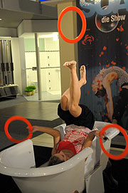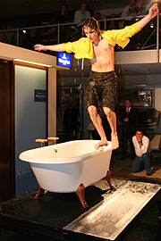 Wer bislang dachte, das Badezimmer sei ein Ort des intimen Rückzugs, wird ab 1. Mai 2008 im Deutschen Theater überrascht werden. Die Zuschauern erwartet bei SOAP - die Show auf der Bühne ein ungewöhnliches, nass-fröhliches, artistisches Spektakel: Armaturen werden zu Telefonen, Duschvorhänge laden zu waghalsigen Kletterpartien ein und Begegnungen in der Wanne führen zu einem wahren Bad der Gefühle. Kurzum: eine atemberaubende Mischung aus artistischen Höchstleistungen und einem mitreißenden Soundtrack. Einen kleinen Vorgeschmack erhielten die Gäste einer Einladung der Bäder- und Fliesenwelt der Villeroy & Boch Niederlassung München am Giesinger Bahnhofsplatz, einem geschwungen stylischen 50er Jahre Gebäude, in dem noch bis 1971 ein Kino die Obergiesinger unterhielt und seit Ende der 70er Jahre Vilelroy & Boch ausstellt. Vor 3 Jahren hatte man mit einem Umbau die Ausstellung auf den neuesten Stand gebracht, mit der Einladung zur SOAP Vorstellung wurde nun auch der letzte Teil des Umbaus abgeschlossen. Die ukrainische Antipoden-Künstlerin Nata Golkina - Meisterin der biegsamen Zehen (und Absolventin der Folkwang Hochschule in den Sparten Körpertheater und Pantomime) sowie der Handstandakrobat Florian Zumkehr in der Wanne , der von Maximilian Rambaek an der Staatlichen Ballettschule Berlin und Schule für Artistik "entdeckt" und für Soap engagiert wurdegaben einen kurzen Ausblick auf das, was die Gäste dann ab 1. Mai auf der Bühne erwartet. SOAP - Das Musical - Ein überraschendes Spektakel Es sind mehrere Badewannen, die auf und über der Bühne zu finden sind. Jede von ihnen beherbergt eine Geschichte und einen Artisten mit außergewöhnlichen Fertigkeiten. „SOAP die Show“ bringt alle ihre Fähigkeiten zusammen und in eine spannende Dramaturgie mit Kontorsion, verschiedensten Formen der Jonglage, Luftakrobatik, Trapez, Ketten, Antipoden, Gesang und natürlich Seifenblasen! Ergänzt mit Popmusik, die mit viel Feingefühl ausgesucht wurde und beeindruckenden Lichteffekten, die das Geschehen zusätzlich aus ungewöhnlicher Perspektive wiedergeben, ist „SOAP die Show“ ein buntes, kurzweiliges und ungewöhnliches Spektakel. Körperkunst in Höchstform Hochkarätige Artisten aus aller Welt bringen ihr großes Talent und ihre künstlerischen Erfahrungen in die Entstehung und Ensemblearbeit ein. Besonders ist auch die Einbindung von Künstlern anderer Genres wie Schauspielern, Sängern oder Tänzern. So sorgt hier eine Opernsängerin für die „stimmliche Klammer“ der Inszenierung. Durch die Einflüsse verschiedener Genres entsteht eine hochqualitative und moderne Form der Unterhaltung. Die Wurzeln der Show, die im klassischen Varieté liegen, werden keineswegs komplett ausgeblendet. Im Gegenteil: Die Inszenierung versteht sich als Weiterentwicklung, die die Tradition des Varietés in die Moderne übersetzt und durch weitere künstlerische Stilmittel ergänzt. Von aufsehenerregender Luftakrobatik über der Bühne und atemberaubenden Handstand-Figuren auf dem Wannenrand bis zu ungewöhnlichen Jonglagen. Von verwirrend schnellen Ballspielen bis zu äußerst komischen Pantomimen, von zuweilen erotischem aber auch romantischem Körpereinsatz bis zu immer wieder überraschenden Varianten eines beliebten Schlagers. SOAP die Show erweitert das Spektrum der artistischen Kunst um bisher nicht gekannte Formen und Ausdrucksweisen. Tourneeauftakt im Deutschen Theater Die beiden Regisseure Markus Pabst und Maximilian Rambaeck schufen ein modernes, spritziges und witziges Show-Spektakel mit packender Weltklasse-Akrobatik, Musik und Humor, atemberaubender Körperbeherrschung und vielen Fontänen! SOAP die Show begeistert bereits seit 10 Monaten die Zuschauer am Chamäleon Theater (www.chamaeleonberlin.com) in Berlin statt 4 wurden es 14 Monate Laufzeit in berlin, mit der in München begonnenen Tournee geht nun die Erfolgstory weiter. Die Show wurde, auch während der Spielzeit in Berlin, weiterentwickelt und den Rahmenbedingungen des Deutschen Theaters angepasst. Jetzt verwandelt diese einzigartige Show seit dem 1. Mai 2008 das Deutsche Theater in Münchens verrücktestes Badehaus. *Villeroy & Boch als Spezialist für hochwertige Badewannen unterstützt die ungewöhnliche Produktion tatkräftig: Das Unternehmen stellte dem Berliner Chamäleon Theater in den Hackeschen Höfen (Rosenthaler Straße 41, 10178 Berlin) für seine Produktion „Soap“ freistehende Badewannen zur Verfügung, die als ungewöhnliche „Showgirls“ zu den Protagonisten der nassfröhlichen Bühnenshow gehören. Villeroy & Boch entschied sich in Zusammenarbeit mit dem Chamäleon Theater für die erfolgreiche Kollektion Hommage, bei der die Wannen auf eleganten Holzfüßen stehen und sich durch eine klassische Linienführung sowie durch einen geschwungenen Rand auszeichnen. Gefertigt werden die Wannen Hommage aus hochwertigem Quaryl, einem patentierten Werkstoff von Villeroy & Boch, wodurch sie nicht nur besonders formschön, sondern auch außergewöhnlich strapazierfähig sind. Ebenfalls aus Quaryl gefertigt ist eine weitere Wanne aus der Kollektion Aveo, deren preisgekröntes Design des Londoner Designbüros Conran & Partner eine gelungene Verbindung von Eleganz und Perfektion darstellt. Damit gehört Aveo ohne Zweifel zur Starbesetzung. Die freistehende, ovale Wanne besitzt einen einteiligen Unterbau, der das geradezu nahtlose Wannendesign in besonderer Weise zur Geltung bringt.