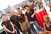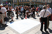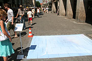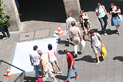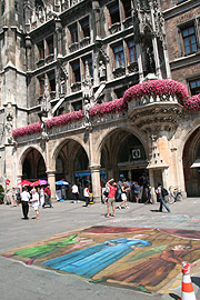 Gemalt werden Arbeiten von Peter Bömmels (Köln), Anke Doberauer (München/Marseille), Thomas Grundmann (Köln), Frank Herzog (Köln), Karin Kneffel (Düsseldorf), Bénédicte Peyrat (Paris), Christian Macketanz (Rom), Stephan Melzl (Frankfurt/Basel), Beate Spalthoff (Berlin), Michael Kunze (Berlin), Norbert Schwontkowski (Berlin), Alex Tennigkeit (Berlin), Jochen Twelker (Berlin), Uwe Oldenburg (München) und Florian Süssmayr aus München. Regen, Kälte und Schnee bis in die Niederungen. Im Juni wollte das Wetter für das 9. RISCHart_PROJEKT “Meistermaler" zeitgenössische Malerei direkt auf die Straße zu bringen, keine Chance. Deshalb wurde das Projekt von Anfang Juni auf Ende Juli verschoben worden. Für mehrere Wochen wurde die Münchner Fußgängerzone zwischen Marienplatz und Stachus zum begehbaren Atelier. Neugierige Passanten und kunstinteressierte Zuschauer können den Straßenmalern über die Schulter schauen und beobachten, wie die lebensgroßen Werke entstehen. Begonnen wurde schon am 21. Juli 2006 direkt unter dem Rathaus, auf dem Marienplatz. Fünf professionelle Straßenmaler - Roland Josultis, Marion Ruthardt, Lisa Schöler, Melanie Siegel und Gregor Wosik setzen live vor Ort insgesamt 15 Vorlagen bekannter zeitgenössischer Künstler als Straßengemälde um. „Eintritt frei!“ heißt es. Die Straße wird zur Kunsthalle, zu einem temporären Museum. Gemeinsam begannen die fünf Straßenmaler auf dem Marienplatz zunächst der Tradition der Straßenmalerei entsprechend, mit einem klassischen Motiv: der „Madonna del Parto“ (1467/68) von Piero della Francesca. Das Fresco wurde für die toskanische Friedhofskapelle in Monterchi geschaffen. Es stammt aus der Frührenaissance, zwei Engel präsentieren die hochschwangere Maria. Die Gottesmutter stand schon immer im Mittelpunkt der historischen Straßenmalerei, denn ursprünglich begleiteten Straßenmalereien christliche Prozessionen. Auch heute noch begegnen uns in der Straßenmalerei die großen Namen der Kunstgeschichte mit ihren prominenten Werken. Das RISCHart_PROJEKT MEISTERMALER knüpft an diese Tradition mit unterschwelligen Irritationen an, die der Straßenmalerei eine neue Seite abgewinnen und zugleich einen unerwarteten Blick in ihre Geschichte eröffnen. Initiiert wird das ungewöhnliche Kunstprojekt MEISTERMALER von dem Münchner Unternehmer Gerhard Müller-Rischart, der bereits seit 1983 unter dem Signet RISCHart_PROJEKTE Künstler fördert. Inzwischen sind seine Projekte Teil des kulturellen öffentlichen Lebens in München geworden, dafür wurde er vom Oberbürgermeister Ude mit der Auszeichnung München leuchtet geehrt. Ausstellung: Meistermaler direkt auf die Straße - 10. RISCHart-PROJEKT: ACHTHUNDERTFÜNFZIG in München. Zehn künstlerische Positionen zur Münchner Stadtgeschichte vom 1. bis 31. Juli 2008 (mehr) - Das traditionsreiche Unternehmen Rischart feierte 2008 seinen 125. Geburtstag. Medaille „München leuchtet” in Gold für Gerhard Müller-Rischart am 20.12.2008 (mehr) City Partner München e.V. - die Münchner Stadtmarketinggesellschaft (mehr) |