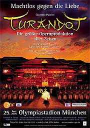 Turandot, Giacomo Puccinis große Oper und Liebesgeschichte mit der weltbekannten Arie „Nessun dorma!“, kommt als größte Opern-Produktion aller Zeiten exklusiv für drei Aufführungen nach Europa. Der Olympiapark schreibt mit Turandot die Geschichte von klassischen Großereignissen fort. Bereits 1996 sorgten die „3 Tenöre“ im Olympiastadion für Furore. Und die größte Opernproduktion aller Zeiten passt perfekt in die weit gefächerte Palette der Veranstaltungen im Olympiapark. „Neue innovative Ideen und Konzepte, ausgefallene Ereignisse und publikumswirksame Veranstaltungen, dafür war, ist und bleibt der Olympiapark München die große Bühne“, so Olympiapark-Chef Wilfried Spronk. „Ganz ehrlich: Auf dieses Ereignis freue ich mich besonders. Die größte Opernproduktion der Welt in einem der schönsten Stadien der Welt.“ Die Premiere von Turandot fand am 28.05.2005 in Paris im Stade de France statt. Der Mitte Februar begonnene Vorverkauf für München lief bereits so gut, das wenige Tage vor der Aufführung rund 26.000 der 30.000 Plätze bereits verkauft sind. Die übrigen Karten sind noch an den Vorverkaufsstellen erhältlich, bzw. am Samstag zwischen 10 und 15 Uhr im Verkaufpavillon an der Eislaufhalle und ab 16 Uhr an der Abendkasse. Für die Regie dieses einzigartigen Opernspektakels zeichnet der Chinese Zhang Yimou verantwortlich. Im Jahre 1998 inszenierte der durch seinen Film „Die Rote Laterne“ weltbekannte und mehrmals oscarnominierte Regisseur die Oper zum ersten Mal mit mehr als 30.000 begeisterten Besuchern monumental vor der Originalkulisse der legendären Verbotenen Stadt in Peking. Ein koreanischer Produzent holte Zhang Yimou’s umjubelte Turandot-Inszenierung 2003 erstmals in ein Fußball-Stadion. Für die Umsetzung musste die Kulisse der Verbotenen Stadt originalgetreu nachgebaut werden. Das Ergebnis war die größte Opernbühne aller Zeiten, 170 Meter breit und 43 Meter tief. Im Worldcup Stadium von Seoul, in dem Deutschland ein Jahr zuvor das Finale um die Fußball WM 2002 gegen Brasilien mit 0:2 verlor, begeisterte Turandot 120.000 Zuschauer in drei ausverkauften Shows. In Kooperation mit der Olympiapark München GmbH bringt die Deutsche Produktionsfirma Premium Classics GmbH diese legendäre Produktion im Rahmen einer Deutschlandpremiere nach München. Die gigantische Bühne wird zu diesem Zweck noch einmal originalgetreu in China über einen Zeitraum von dreieinhalb Monaten gefertigt. Auch das komplette Bühnen- und Showkonzept wurde nochmals überarbeitet. Die Aufbauzeit der Bühne wird im Olympiastadion München allein zehn Tage in Anspruch nehmen. Für die Europapremiere in Paris sind drei Wochen für Proben und Aufbau vorgesehen. Mehr als 120 Menschen sind mit dem Aufbau beschäftigt. Aufgrund der enormen Größe wird die Bühne in München gegenüber der Haupttribüne aufgebaut, d.h. das Stadion wird der Länge nach bespielt. An höchster Stelle misst die Bühne 24 Meter. Turandot ist somit die größte Open Air Tour Produktion der Welt - doppelt so groß wie Rockproduktionen à la Rolling Stones. Der Transport des Bühnenbildes, der Kostüme und Requisiten erfolgt in 40 Seecontainern von China nach Europa. 5000 handgefertigte Kostüme und Accessoires aus feinster chinesischer Seide, sowie über 600 Requisiten kommen zum Einsatz. Die Opernbühne steht auf 200 Tonnen Gerüst. Für den Transport des Gerüstmaterials wurden zusätzlich 40 Sattelschlepper benötigt. Mehr als 500 Mitwirkende, davon 60 chinesische Tänzer, 150 Statisten sowie ein 120 Mann starker Chor wirken in diesem einzigartigen Spektakel mit, welches in den letzten tagen nach und nach im Olympiastadion aufgebaut wurde und seiner eintägigen Verwendung harrt. Sollte übrigens - und nur dann - am Samstag abend schlechtes Wetter , Gewitter , Sturm oder was auch immer herrschen, ist als Ausweichtermin der Sonntag geplant. Aber nur dann. Die Wetteraussichten sindjedenfalls sehr positiv wenige Tage zuvor, es verspricht eine Aufführung an einem lauen Sommerabend zu werden. Übrigens ist der Beginn kurfristig um eine halbe Stunde nach hinten verlegt worden, statt um 20.00 Uhr beginnt das Spektakel um 20.30 Uhr, da viele der Lichteffekte erst in der Dämemrung oder Nacht so richtig zur Wirkung gelangen können, wie man bei der Aufführung in Paris feststellen musste. Der Drei-Tenöre-Dirigent Maestro Janos Ács leitet die Budapester Philharmoniker. Um dem Besucher ein Erlebnis mit allen Sinnen zu garantieren, wurde ein erheblicher Teil der Produktionskosten in Licht- und Tontechnik investiert. Eine HIFI Tonanlage neuester Bauart garantiert „Opernhausklang“. Mit 60 % überdachten Sitzplätzen ist das Wetter-Risiko gegenüber vergleichbaren Open Air Veranstaltungen minimiert. Karten von € 28 bis € 153 gibt es seit dem 19.2.2005 bei München Ticket, Tel.: 0180 54 81811 sowie bei den bekannten Vorverkaufsstellen und Reisebüros. Weitere Infos unter www.turandot-oper.de. Für die entspannte An- und Abreise der Besucher bietet die Münchner Verkehrsgesellschaft (MVG) mit ihren Verkehrsmitteln U-Bahn, Bus und Tram vielfältige Möglichkeiten: Neben der U-Bahnlinie U3, die an diesem Tag bis 1 Uhr im 10 Minuten-Takt verkehrt und noch weitere Fahrtmöglichkeiten bis 2 Uhr bietet, setzt die MVG von 17 bis 19 Uhr und nach Veranstaltungsende zusätzliche Sonderzüge zwischen den U-Bahnhöfen „Hauptbahnhof“ und „Olympiazentrum“ ein. Weiterhin fahren auch die MetroBus-Linie 51 sowie die StadtBus- Linien 173 und 174 das Olympiazentrum direkt an. Ab 1.31 Uhr verkehrt auch die Nachtbuslinie N42 („Dülferstraße“ bis „Münchner Freiheit“) am Olympiazentrum im 30-Minuten-Takt. Mit der Metro- Bus-Linie 50 („Moosach Bahnhof“ bis „Johanneskirchen Bahnhof“) ist das Olympiastadion von der Haltestelle „Olympiapark- Eissportstadion“ aus ebenfalls gut zu erreichen. Und die Tramlinie 20 (bzw. N20 ab 1.46 Uhr) bringt die Besucher von der Innenstadt zur Haltestelle „Olympi