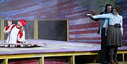 Brecht zielt mit der Dreigroschenoper auf die Entlarvung der korrupten Bourgeoisie. Auf der einen Seite erscheint der Bettlerkönig Peachum (Stefan Ruppe) als Musterbeispiel des Geschäftemachers, für den Not und Armut nichts anderes sind als Mittel zum Zweck; auf der anderen Seite entpuppt sich der skrupellose Verbrecher Mackie Messer (Pascal Fligg) als Prototyp so genannter bürgerlicher Solidität. Peachum mobilisiert die Bettlermassen, organisiert eine Demonstration des Elends und droht, den Krönungszug zu stören, falls der korrupte Polizeichef Tiger-Brown (Tobias van Dieken) sich weigern sollte, Mackie Messer zu verhaften, der Peachums Kreise störte. Stückl findet auch textlich aktuelle Bezüge in dem Stück, das in einer an Sergeant-Pepper erinnernden Bühnebild gespielt wird. Die musikalische Leitung hat der Schongauer Micha Acher, der mit 9 in gelben Uniformen gekleideten Musikern von einer in den Zuschauerraum vorgeschobenen Bühne die richtigen Töne findet. Herausragend stimmlich als Polly Peachum spielt die erst im 2. Jahr an der Theaterakademie Everding Musical studierende Sybille Lambrich.