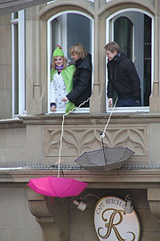 Doch stetig kommen sie an, die Rosenmontagszug Freunde und für mich ist es Zeit, einen Aussichtspunkt im 1. Stock vis à vis aufzusuchen, der mich in Augenhöhe mit den Prinzen, zugleich mit Heizkörpern in greifbarer Nähe bringt: bei dem frostigen Programm draussen immer nützlich. Oder man machts wie die Prinzen: doppelte Unterwäsche zum Beispiel soll recht nützlich sein.