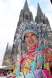 Doch vergeht jetzt erst einmal die Zeit mit Warten, ein Blick ins Programm hätte mir es ja zeigen können, später aufstehen wäre durchaus möglich gewesen an dem Tag. Zwar startet der Zug schon um 10.30 Uhr an der Severinstorburg, doch bis er sich mal die knapp 6 km bis in Höhe Dom vorgearbeitet hat, braucht der Zug mit seinen insgesamt 46 Gruppen und dazu zahlreichen Vorgruppen dann doch gut 2 Stunden. Was mich dazu bringt, die Chinesische Karnevalsprinzession Jie kennenzulernen, die im Brauhaus Restaurant "Der Landgraf" (www.der-landgraf.com), eine halbe Stunde von Peking entfernt, in Badaling direkt am 4. Turm der Mauer, für ein Jahr gewählt wurde, und jetzt Köln und dessen Karnevals- Sitzungen besuchen darf die letzten Tage.