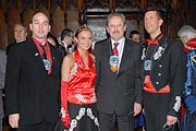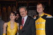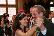 Gebeugt, aber sicherlich nicht gegrämt verließ am Freitag-Mittag ein Stadtoberhaupt den kleinen Sitzungssaal des Rathauses, wie immer in den letzten Jahren behängt mit Orden der Münchner Faschingsvereine. Zum 15. Mal lud 2007 Münchens Oberbürgermeister Christian Ude zur Begrüßung der Münchner Faschingsprinzen und -Honoratioren ins Rathaus, und alle kamen. Was man schon vom Marienplatz her sah, denn dort standen ausnahmsweise mal all die mit Kronen und anderen Insignien aufgebrezelten Prinzenautos, in der Regel von Autohäusern oder - Niederlassungen gesponsert. Aus allen Teilen Münchens waren sie erschienen, die Prinzenpaare aus Moosach, aus Laim, die der Feringa, die aus dem Hasenbergl, aus Neuhausen, von der Gleisenia, die Würmesischen und Narrhallesischen Prinzenpaare dieser Stadt. Und nicht zu vergessen die Damischen Ritter und die Mädels von der Westerngarde. Neu in diesem Jahr dabei: ein Prinzenpaar der Faschingsfreunde Sendling, die sich erst im Vorjahr gegründet hatten. Zur Begrüßung gehört eine Ordensverleihung, und so gab's ein Küßchen hier , ein Küßchen da, der Oberbürgermeister natürlich als Gastgeber im Mittelpunkt des Geschehens.