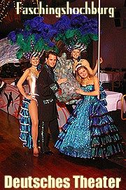 29.01.2006, Sonntag 16.00-22.00 Uhr Karneval wie Dazumal. "Komm in den Garten der 1000 Melodien" Das Deutsche Theater lädt in Zusammenarbeit mit der Theatergemeinde München zu einem Kostümfest und Gesellschaftsball in der Tradition und mit dem Charme des alten Münchner Faschings ein. Freuen Sie sich auf sechs Stunden Tanz und faszinierende Showtanzgruppen vom Nachmittag bis in den späten Abend. Wie immer mit dabei: Die beliebte Münchner Française!Tischplätze € 12,- bis 25,-, Saalkarten € 10,-, zzgl. Vorverkaufsgebühr + Systemgebühr & ggf. zzgl. Servicegebühr. Garderobe zwanglos, aber mit Phantasie |