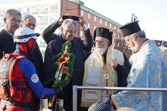 Auf der Ludwigsbrücke, versammelten sich wie schon seit 2002, als erstmals in München diese Zeremonie zelebriert wurde, wieder Hunderte winterlich verpackte Gläubige. Es ist ja auch ein großes Familientreffen, Junge Familien mit ihren Kindern, aber auch viele Ältere, oft gerade zurück aus den hier gewährten Weihnachtferien, tauschen sie in allen Sprachen Süd-Osteuropas dann Neujahrsgrüße, Neuigkeiten und Küsse aus, derweil liturgische Gesänge über die Isar ziehen. Der Gottesdienst auf der Ludwigsbrücke vor dem Deutschen Museum am 6. Januar 2015 begann um 12.30 Uhr und dauerte ungefähr 15 bis 20 Minuten. Seine Exzellenz, Bischof von Aristi Vassilios (Weihbischof der Griechisch-Orthodoxen Metropolie von Deutschland), der Bischöfliche Vikar in Bayern, Erzpriester Apostolos Malamoussis und die in München tätigen griechisch-orthodoxen Priester segneten bei Sonnenschein am 6.1.2015 die Isar. Als symbolische Segnung wird dem Fluß mehrfach einblumengeschmücktes Kreuz übergeben. Mutige Gläubige trotzen in Griechenland der Kälte bei diesem Brauch, springen in das kalte Wasser und suchen dort das Kreuz. Hier in der 4 Grad kalten Isar wird dies 2015 von den Brüdern Georgios (16) und Alexandros (14) Mantzaridis übernommen, die das Kreuz herausholen, damit es wieder wieder herausgefischt wird. Diese erstmalige Mitwirkung von minderjährigen Schwimmern, „soll an einem solchen Tag auch ein kleiner Beitrag für eine so schöne traditionelle Zeremonie sein“, bemerkt der Vater beider Jugendlichen, Iosif Mantzaridis. Auch Rettungsschwimmer von der Kreiswasserwacht nahmen wie jedes Jahr teil. Seine regelmäßige Teilnahme hat dieser Veranstaltung ein unschätzbares Gewicht verliehen und sie zu einer wirklichen Größe im Leben der Stadt München gemacht, lobte man Uds Teilnahme im Vergangenen Jahr, als er letztmals in seienr Funktion als Oberbürgermeister teilnahm - Rückblick: Isar Gewässerweihe 2016 (mehr)