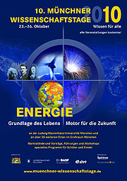 23.-26.10.2010 - 10. Münchner Wissenschaftstage. Im Mittelpunkt der Münchner Wissenschaftstage steht in diesem Jahr das Phänomen Energie. Ohne sie gäbe es kein Leben und keine Zukunft. Spitzenforscher und -techniker werden dieses Phänomen allgemein verständlich darstellen und erläutern. Die Münchner Wissenschaftstage "Energie: Grundlage des Lebens - Motor für die Zukunft" finden von Samstag, 23. Oktober, bis Dienstag, 26. Oktober, statt. Zentraler Veranstaltungsort ist das Hauptgebäude der Ludwig-Maximilians-Universität München. Ganztägig findet hier am Wochenende, 23. und 24. Oktober, im Audimax ein Vortragsprogramm statt. Experten präsentieren an den Marktständen der Wissenschaft aktuelle Ergebnisse Ihrer Forschungen. Von Samstag bis Dienstag, 23. bis 26. Oktober, bieten zudem Hochschulen, wissenschaftliche Institutionen und forschende Unternehmen im Großraum München Führungen, Vorträge, Workshops und Tage der offenen Tür an. Spezielle Workshops sprechen Schüler und Kinder an. Highlights sind die vier Abende in der Großen Aula der LMU: Am Samstag, 23. Oktober, steht die Frage: "Wie weit kommen wir mit den regenerativen Energien?" im Mittelpunkt. Darüber referieren und diskutieren die Energieexperten Dr. Hermann Scheer, Träger des Alternativen Nobelpreises, und Professor Günther Hasinger, Direktor des Max-Planck- Instituts für Plasmaphysik. Um die Frage "Mit Kernkraft gegen CO2-Schleudern?" geht es am Sonntagabend. Am Montag, 25. Oktober, liest u. a. Udo Wachtveitl, Darsteller des Tatort-Kommissars Leitmayr, aus dem Öko-Thriller "Ausgebrannt" von Andreas Eschbach. Am Dienstag, 26. Oktober, referiert und diskutiert zum Thema "Energiepolitik und Klimaschutz im 21. Jahrhundert" Professor Ottmar Edenhofer vom Potsdam-Institut für Klimafolgenforschung und Mitglied im Weltklimarat, mit Professor Ferdi Schüth, Direktor des Max-Planck-Instituts für Kohleforschung. Dr. Reinhard Breuer, Chefredakteur der Zeitschrift 'Spektrum der Wissenschaft', moderiert den Abend. |