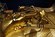 Authentisches Gesamtbild mit aufwändigen Rekonstruktionen In der Ausstellung TUTANCHAMUN SEIN GRAB UND DIE SCHÄTZE erleben Jung und Alt, Familien, Schulklassen und Gruppen das Abenteuer des Fundes heute nach: Auf lehrreiche und unterhaltsame Weise wird Carters Entdeckung dreidimensional mittels „virtueller Archäologie“ in der originalen Fundsituation dargestellt sowie in einen monumentalen Gesamtzusammenhang mit über 1.000 Objekten, Grafiken und Filmen gebracht. Ein Audioguide, Führungen von Ägyptologen sowie ein neuer Kinderkatalog bringen dem Publikum den berühmten Pharao und seinen Grabschatz nahe. Die Ausstellung fasziniert zum einen, indem sie mit Hilfe sorgfältig gearbeiteter Rekonstruktionen einen lebendigen Eindruck von der bedeutenden archäologischen Entdeckung im Tal der Könige vermittelt. Die Replikate ermöglichen die Realisierung der ambitionierten Ausstellungsidee und dienen zugleich dem Schutz der hochsensiblen, Jahrtausende alten Originale. Alle hier gezeigten Objekte des Grabschatzes wurden von ägyptischen Kunsthandwerkern in Abstimmung mit erfahrenen Ägyptologen detailgetreu nachgebildet. Zum anderen stellt die Ausstellung in einzigartiger Weise einen originalen Fundzusammenhang her. Sie vereint dabei, was heute selbst in Ägypten nur getrennt zu sehen ist: Während die Schätze des Königs im Museum von Kairo aufbewahrt werden, befindet sich sein Grab mit den Wandmalereien, der Mumie des Königs, dem äußeren Sarg und dem steinernen Sarkophag im Tal der Könige. Auch die nach der Entdeckung abgebrochene und später verloren gegangene Wandmalerei mit der Göttin Isis an der Südwand der Grabkammer ist in der Münchener Ausstellung in ihrer ursprünglichen Farbenpracht zu sehen. Besucher schlüpfen in die Rolle des Entdeckers Nach einer Einführung in die Kultur des Alten Ägyptens und in die Zeit Tutanchamuns erlebt der Besucher in einer filmischen Einleitung Howard Carters spannende Suche nach dem Grab. Danach öffnet sich ein Raum, in dem der Ausstellungsgast die Schätze des Pharaos in drei Grabkammern genauso vorfindet wie der Entdecker was mit ihm nur einem kleinen Kreis von hochrangigen Besuchern des Grabes in Luxor in den Wintermonaten von 1922/23 vorbehalten war. Im zweiten Ausstellungsteil befassen sich die Besucher mit den wichtigsten Objekten des Grabschatzes wie den goldenen Kanopenschrein für die Eingeweide, den Goldthron des jugendlichen Pharao oder die Götterfiguren. Im Mittelpunkt stehen die großen, vergoldeten Schreine aus der Sargkammer des Königs, die wie in einer gewaltigen Magistrale präsentiert werden, ausgehend vom äußeren Schrein über die Särge bis zur berühmten Goldmaske. Anschauliche und wissenschaftlich fundierte Großgrafiken, Audioguide und neue Kurzfilme erklären die Bedeutung der Objekte des Grabschatzes im Kontext des ägyptischen Götter- und Jenseitsglaubens.