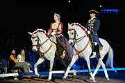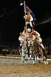 Über 30 Königspferde mit der internationalen Reiterelite präsentieren in dieser opulenten Show erlesene Reitkunst, aber auch artistisches Können von Mensch und Pferd. Nichts aus der historischen und gegenwärtigen Welt des Pferdes wird in dieser über zweistündigen Performance ausgeschlossen: Pas de deux und langer Zügel, Damensattel, Quadrillen und Grand Prix Kür, Pesade, Levade, Capriole, Courbette. In Freiheitsdressuren, im Voltigieren und sensationellem Trickreiten sowie Showjumping bis hin zu leuchtenden Pferden entsteht ein unvergleichliches Zusammenspiel von Reiter und Pferd, eingebunden in mittelalterliche Ritterturniere, in orientalischen Impressionen und in den traditionellen spanischen Reitkünsten Bolero, Stierkampf, Feria, Garrocha. In einer beeindruckenden Choreografie zeigt sich immer wieder die präzise und elegante Harmonie von Pferd und Reiter. Die Reiterelite von den elitären europäischen Gestüten und Reitschulen präsentiert in der „Gala der Königspferde“ mit ihren erlesenen Pferden sowohl die landes- und rassetypische Reitkultur als auch atemberaubende und spektakuläre Attraktionen wie Jagdszenen, Ungarische Post und aussergewöhnliche circensische Lektionen. Als spezielle Gäste wirken einstige Reiter der Spanischen Hofreitschule Wien und Kunstreiter vom russischen Staatszirkus mit, sowie die mehrfache amerikanische Meisterin mit dem „Black Beauty“ American Saddlebredhorse. Kunst und Können, Show und Schönheit, elitär und elegant, professionell und perfekt das ist die „Gala der Königspferde“, das Original der berühmten, traditionellen „The Royal Horse Gala“. Ein königliches Vergnügen für die ganze Familie, an das man sich noch erinnern wird, wenn alles andere längst vergessen ist. 05.03.05 München Olympiahalle 15 Uhr + 20 Uhr Karten z.B. bei Eventim für die 20 Uhr Vorstellung zwischen 23.20 und 57,50 €