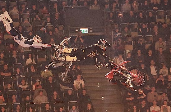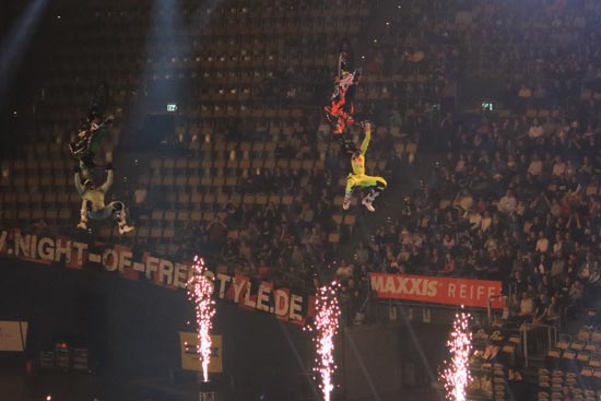 Im Freestyle Motocross ging es langsam los mit den anfänglichen Tricks aus den späten 90er Jahren, über den immer beliebten Whipcontest, bis hin zu einem Battle gegen die anderen Sportarten ohne Motor und das Highlight, den Syncro Contest. Bei diesem wurden jeweils von zwei Fahrern nebeneinander der gleiche Trick gezeigt. Absolutes Highlight zum Schluss war der side by side Double Backflip vom australischen Ausnahmetalent Pat Bowden und dem frisch gekrönten Weltmeister Luc Ackermann.