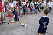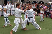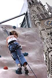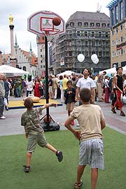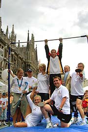 Auf 2.000 qm Aktionsfläche wird ein großer Fitness-Parcours mit diversen Angeboten zum Mitmachen, Anfassen und Ausprobieren aufgebaut. Die Open-Air-Aktionen finden jeweils am Wochenende statt. Von Freitag bis Sonntag erwarten Sie ein großes Bühnenprogramm und professionelle Moderatoren, die für Motivation und gute Laune sorgen. Vom 18. bis zum 30. Juli macht „Deutschland bewegt sich!“ die Gesundheitsinitiative Station in München. Die Initiatoren Barmer, Deutschlands größte Krankenkasse, Bild am Sonntag und ZDF möchten die bayerische Landeshauptstadt im wahrsten Sinne des Wortes bewegen für ein gesünderes, besseres und längeres Leben. In der ganzen Stadt dreht sich dann zwei Wochen alles um die Themen Bewegung, Prävention sowie gesunde Ernährung. Rund 80 Partner bieten mehr als 400 attraktive Programme zum Mitmachen an. Neben den Aktionswochen gibt es eine Open Air Aktion: am 30. Juli auf dem Marienplatz, von 10 bis 18 Uhr. Schirmherr ist Oberbürgermeister Christian Ude. Highlights waren u.a. die Premiere des einzigartigen „Deutschland bewegt sich!“-Tests und die Autogrammstunden mit Magdalena Brzeska und Fabian Hambüchen. Am Reck zeigte Hambüchen einige Auszüge aus seinem Programm, live und in Mitten der zahlreichen Münchner, die den Europameister am Reck 2005 erleben wollten. Bei uns finden sie eine Fotogalerie mit Fabian Hambüchen, Teil 1, Teil 2. sowie eine Fotogalerie mit Magdalena Brzeska, jeweils mit Bildern zum vergrössern, Teil 1, Teil 2. Auf dem Marienplatz konnten Sie Ihre Fitness testen und gegen den Sieger der Paralympics 2004 im Tischtennis antreten, auch konnten sie von Samsung einen Platz als Fackelläufer bei den Olympischen Spielen 2006 in Turin gewinnen. Exklusiv für die BARMER entwickelte der Deutsche Turnerbund zusammen mit den Universitäten Bayreuth und Karlsruhe Fitnesstests für Einsteiger und Fortgeschrittene. Prüfen Sie selbst, wie es tatsächlich um Ihre individuelle Fitness bestellt ist. Besser essen, mehr bewegen, kinderleicht! Die Initiative von Bundesministerin Renate Künast hat das Ziel, dem Übergewicht bei Kindern und Jugendlichen entgegenzuwirken An den Tour-Wochenenden gibt es jeweils einen Dome speziell für Kinder und Jugendliche. Eine Woche vorher und nachher machen zahlreiche Aktionen Lust auf gesunde Ernährung. Z.B. das Kindermusical "Pappe satt" sowie unterschiedliche Werkstatt-Angebote in Tagesstätten für Kinder und Jugendliche aller Altersgruppen. München bewegt sich! Open Air Aktion Die Open Air Aktion findet statt auf dem Münchner Marienplatz von 10.00 bis 18:00 Uhr. Programm 10.00 Eröffnung Dr. Eckart Fiedler, Vorstandsvorsitzender der BARMER , Diana Stachowitz, Stadträtin der Stadt München Johann Wolf, Regionalgeschäftsführer der BARMER , Magdalena Brzeska, 26-fache Deutsche Meisterin in Rhythmischer Sportgymnastik 10.15 Lach-Yoga zum Mitmachen Christoph Emmelmann, 1. Münchner Lach-Yoga-Schule, Lach-Yoga-Instructor 10.30 Start Munich-Walk Nordic-Walking Mitmachaktion Pichlers Nordic-Walking Schule 10.35 Angels Cheerleader Tanzakrobatik 10.45 Zieleinlauf des „Deutschland bewegt sich!“ Laufes Start um 9.00 Uhr von der BUGA 05 zum Marienplatz, Peter Gottwald (SmartRunning) gibt Tipps zum gesunden Laufen 11.10 Fassadenklettern des Deutschen Alpenvereins (DAV) Vorführung an der Fassade der Galeria Kaufhof, Marienplatz 11.20 Spinning-Show Betriebssportgruppe der Stadtsparkasse 11.45 Grenzerfahrung im Triathlon: Dr. med. Ulrich Nieper, Altersklassensieger im Ironman Hawaii Triathlon 11.55 Magdalena Brzeska Vorführung in Rhythmischer Sportgymnastik 26-fache Deutsche Meisterin in Rhythmischer Sportgymnastik 12.00 Start Munich-Walk Nordic-Walking Mitmachaktion Pichlers Nordic-Walking Schule 12.10 Sport als Prävention? Dr. med. Wolfgang Hoppenthaller, Vorsitzender des Bayerischen Hausärzteverbandes e.V. 12.20 Karate-Vorführung Karate-Dojo Klaus Hirsch (München/Inning) 12.35 Interview und anschließende Autogrammstunde mit Caroline Casaretto Olympia-Gold im Hockey, Athen 2004 12.45 Showkampf Tischtennis Jochen Wollmert & Rainer Schmidt Paralympicssieger 2004 im Tischtennis 13.00 Fabian Hambüchen live am Reck Vorführung Europameister 2005 am Reck 13.10 Eberhard Gienger Ziehung des Samsung Fackelläufers zu den olympischen Winterspielen Turin 2006 Olympia-Goldmedaillengewinner im Turnen 13.20 Laufen in München? Ulla Chwalisz gibt Tipps Autorin des Laufbuches „Laufen in München“ mit anschließender Verlosung einiger Exemplare des Buches 13.30 Turnen Sie mit Magdalena Brzeska 26-fache Deutsche Meisterin in Rhythmischer Sportgymnastik mit anschließender Autogrammstunde 13.45 Tanzshow Asics Fitness mit Fitnessweltmeisterin Susan Malekpur Shirazi 14.00 Start Munich-Walk Nordic-Walking Mitmachaktion Pichlers Nordic-Walking Schule 14.05 Fitness-Tipps und Autogrammstunde von und mit Astrid Kumbernuss Welt-, Europa-, Deutsche Meisterin und Olympiasiegerin im Kugelstoßen 14.15 Premiere des „Deutschland bewegt sich!“ Tanzes ADTV-Tanzschulen München anschließend Möglichkeit zum Mittanzen 14.30 Gespräch mit Teilnehmern am 24-Stunden-Laufmarathon von 200 Schülern im Schaufenster der Galeria Kaufhof am Marienplatz für einen wohltätigen Zweck. Laufmarathon von Freitag, 29.07., 14.00 Uhr bis Samstag, 30.07., 14.00 Uhr, Schaufenster Rosenstrasse 14.45 Mitmachgymnastik mit Wasserbällen gemeinsam mit Bernd Auerhammer / Bayerischer Landessportverband 15.00 Fabian Hambüchen Vorführung am Barren Europameister 2005 am Reck 15.15 Bauchtanz mit Bauchtänzerin Ulaya Gadalla Mitmachaktion Tanzstudio Morgenland und Miriam Schäfer 15.35 Michael Käfer von 0 auf 42,2 km . Gastronom mit sportlichem Ehrgeiz zu seinem persönlichen Sportziel Marathon 15:50 Lateinformationstanz „Moulin Rouge“ Vorführung GrünGoldClub München 16.00 Start Munich-Walk Nordic-Walking Mitmachaktion Pichlers Nordic-Walking Schule 16.05 Mitmach-Gymnastik mit Flexibars Body-Up / A.J.‘s health & fitness, München 16.30 Junge Kün