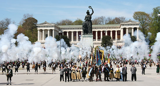 Musikalisch umrahmt wurde diese Veranstaltung vom Spielmannszug des bayerischen Sportschützenbundes und der Blaskapelle aus Au/Hallertau. Aufstellung beim Schießen 40 Schützen stellten sich auf den Stufen der Bavaria auf; auf dem Plateau der Ehrenhalle nahmen jeweils fünf Schützen recht und links Aufstellung. Nach vorne wurden mit jeweils 100 Mann acht Ketten gebildet. Auf Grund eines Gutachtens, das extra für das Böllerschießen an der Bavaria in Auftrag gegeben wurde, musste die Schützen nach links und rechts jeweils einen Abstand von zwei Metern zum nächsten Schützen einhalten. Die einzelnen Ketten hatten untereinander jeweils einen Abstand von 20 Metern einzuhalten. Das Publikum durfte erst in einem Abstand von 50 Metern seitlich und zur vorderen Schützenkette stehen. Da die Böller beim Abschießen eine zwei Meter lange Flammenzunge, auch "Feuerblume" genannt, entwickeln, war dieser Sicherheitsabstand notwendig. Ablauf des Böllerschießens Die Böllerschützen schossen dreimal "Salut", dass heißt, alle Schützen feuerten dreimal zur gleichen Zeit. Dazwischen gab es zweimal "Reihenfeuer": Ein Schütze böllert nach dem anderen. Wenn es zu keinem Zündversagen kommt, sind im Idealfall 850 Böllerschüsse zu hören. Zur Technik des Böllerschießens Böllerschießen stellt eine hohe Kunst dar, die Training, Erfahrung und Sachkunde erfordert. Ein Böllerhandbuch beinhaltet die Sicherheitsrichtlinien. Beim Böllerschießen wird Schwarzpulver, das sogenannte "Böllerpulver", dadurch entzündet, dass der Funken eines Zündhütchens oder Zündplättchens über einen Kanal in das Böllerinnere geleitet wird. Seit 2003 zählt der Böller nach dem deutschen Waffenrecht nicht mehr zu den Schusswaffen, da hier Pulver entzündet und kein Projektil beschleunigt wird. Das Böllerschießen historisch In Oberbayern hat das Böllerschießen eine lange Tradition und ist guter Brauch an besonderen Festtagen wie zum Beispiel Heiligabend oder Neujahr. Auch werden im öffentlichen Leben zur Ehrung hochrangiger Persönlichkeiten oder bei einem Staatsempfang Böllerschützen tätig. Weitere Anlässe zum Böllerschießen sind öffentliche Feierlichkeiten wie Jubiläumsfeiern, Fahnenweihen und Eröffnungsakte. Besonders die bayerischen Gebirgsschützenvereine pflegen die Kunst des Böllerschießens. Als Gebirgsschützenkompanien wurde ihnen bereits im frühen 17. Jahrhundert von Kurfürst Maximilian I. ( 1573-1651) die Erlaubnis erteilt, mit Handböllern zu verschiedenen hochoffiziellen Anlässen zu schießen. Die Böllerschützen treten immer in Tracht auf. Böllerschießen ist eine lebendige Tradition, denn in jüngster Zeit entstehen in Bayern allerorts Böllerschützenvereine nach dem Vorbild der oberbayerischen Gebirgsschützen. In München hat das Böllerschießen Tradition bei der Eröffnung des Münchner Oktoberfests und bei der Siegerehrung des alljährlich im Rahmen dieses Volksfest abgehaltenen Landesschießen des Bayerischen Sportschützenbundes. Die Serie der Jubiläumsaktionen zum 850. Stadtgeburtstag reisst nicht ab: am Dienstag findet bereits der Ritt des Brezenreiters statt, eine Tradition aus dem Jahr 1318, bei der die Brezen an Arme verteilt wurden, und seit vergangenem Jahr wiederbelegt wurde. Wie schon im Mittelalter werden die Brezen bei der Heilig Geist Kirche auf dem Viktualienmarkt verteilt.