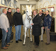 „Die alten Knacker, die werden sich aufführen...“ ahnte im Hintergrund die Stimme aus dem Stall, von wo aus die Ankunft von vier jungen Araberhengsten aus dem Haupt- und Zuchtgestüt Marbach beobachtete. Mahwardi, Nassim, Mashuga und Nafha heißen sie, die hier noch 2 bis 3 Jahre Eingewöhnung und Training vor sich haben, bis sie denn mit ihren älteren Kollegen vor Publikum in die Manege dürfen. Und so war es dann auch ein unüberhörbares Gewieher, kaum das bei vier im Alter von 2 1/2 Jahren noch gar nicht weißen Tiere eher schüchtern die Stallungen und dann ihre Boxen betraten: der Chor von Tierstimmen aufmerksame Blicke, gewölbte Nüstern, stampfende Hufe, den Neuankömmlingen sollte wohl gleich erst einmal akustisch klar gemacht werden, das hier schon ein paar etabliertere Tiere anwesend sind.