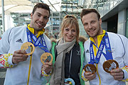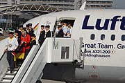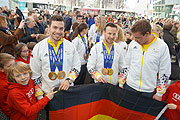 Erster Gratulant war Bundespräsident Joachim Gauck, der die Deutsche Olympiamannschaft direkt auf dem Rollfeld in Empfang nahm. Als erster der rund 100 Athletinnen und Athleten stieg Rodler Felix Loch, Doppelolympiasieger und Fahnenträger bei der Schlussfeier, mit einer Deutschlandflagge aus dem Airbus "Recklinghausen". Am Fuß der Treppe empfingen Gauck, seine Lebensgefährtin Daniela Schadt, DOSB-Präsident Alfons Hörmann, der bayerische Staatsminister des Inneren, Joachim Herrmann, und Münchens Oberbürgermeister Christian Ude die Sportler einzeln per Handschlag, beobachtet von 20 Kamerateams und zwei Dutzend Fotografen. „Wir wünschen uns einen emotionalen Abschluss für die Athletinnen und Athleten. Sie haben mehr als zwei Wochen lang alles gegeben und wir hoffen auf viele Fans, die die Mannschaft gebührend feiern“, sagen DOSB-Präsident Alfons Hörmann und Chef de Mission Michael Vesper unisono. Doppel-Olympiasieger Felix Loch: „Es ist ein Traum als Doppel-Olympiasieger nach Hause zurück zu kommen. Ich freue mich auf Familie, Freunde und natürlich die Fans, die mit uns gezittert und mitgefiebert haben. Da war schon 2010 unglaublich viel los.“