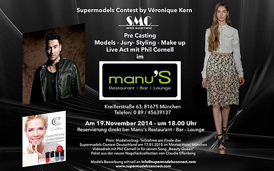 Das Bayern Pre-Casting mit der Wahl des besten Nachwuchsmodels Supermodels Contest by Véronique Kern findet am 19.11.2014 im Rahmen einer Lifestyle Event mit Top eingeladenen Gäste, Werbepartner, VIPs, und Fashion Shows ab 18.00 Uhr im manu's Restaurant Bar Lounge (Kreillerstr. 63, 81675 München) statt. Einmal im Jahr finden Landesausscheidungen unter der professionellen Leitung von Véronique Kern statt. „Deutschlandweit mit tausenden Teilnehmerinnen werden jedes Jahr die schönsten Mädchen gesucht. Der Supermodels Contest ist authentisch und hebt sich somit stark von gängigen TV-Casting Formaten ab. Denn eins steht fest: Die Mädchen, die beim Supermodels Contest gewinnen, starten eine internationale Laufstegkarriere.“... Verfügst Du über eine natürliche Ausstrahlung, bist mindestens 170 cm gross, Konfektionsgrösse 34/36/38 dann bewirb Dich jetzt für den Supermodels Contest by V.Kern das Original seit 1998 und werde eingeladen zum Casting in München. Bewerbungen an: info@supermodelsconnect.com Auf die Gewinnerin wartet nicht nur ein Modelvertrag bei der renommierten Agentur SMC Modelmanagement, die Siegerin des Bayern Pre-Casting kann auch teilnehmen an dem Finale des Supermodels Contest Deutschland am 17.01.2014 im Marriott Hotel München, bei einem Videodreh mit Phil Cornell (www.philcornell.com) für dessen Song "Beauty Queen" und Preise aus der Nagellackkollektion von Claudia Effenberg. Models Bewerbungen können noch angegeben werden unter info@supermodelsconnect.com oder auf www.supermodelsconnect.com . Am 19.11.2014 . Einlass 18:00 h Beginn: 19:00 h