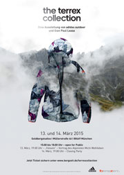Im Ramen der „terrex Collection“ präsentiert adidas Outdoor in Zusammenarbeit mit dem Fotografen Gian Paul Lozza und dem Outdoor-Fachhändler Bergzeit am 13.+14.03.2015 in den Goldbergstudios (Müllerstraße 46, 80469 München im Glockenbachviertel) die neue terrex Kollektion für Frühjahr und Sommer 2015. Inspiriert von den Mood-Boards der adidas Designer hat der Schweizer Fotograf Gian Paul Lozza visuell korrespondierende Landschaftsfotografien erschaffen. Im Rahmen der „terrex Collection“ werden diese zusammen mit den neuen adidas Outdoor Produkten in Szene gesetzt.