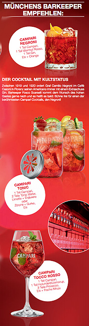 Mit einer Barhopping-Tour feiert Campari in diesem Jahr zum dritten Mal in Folge den Sommer in der bayrischen Metropole. Denn hier in München fällt am 20.06.2015 der Startschuss für die Roten Nacht der Bar Eventreihe! Gefasst machen kann man sich auf 1 unvergessliche Nacht in 10 + 1 angesagten Bars wie wie der "Fantom Bar" oder der "Lucky Who Bar", mit 10 + 1 coolen Musikacts! Los geht es um 19.00 Uhr bei "Rote Nacht der Bars" 2015. Am 20. Juni 2015 erwartet die Teilnehmer ein vielseitiges Programm, das garantiert keine Wünsche offen lässt: Von Rockabilly und Beatboxing über Pop, Electro und Jazz München wird Campari-Rot! Nicht nur die Acts sind so vielseitig wie nie, auch die Drinks können sich sehen lassen: Vom legendären Cocktail-Klassiker Campari Negroni über den erfrischenden Campari Tonic ist bestimmt für jeden Geschmack etwas dabei. Das ganz besondere Extra: Campari verwandelt in diesem Jahr erstmals eine Special-Location in eine Campari-Bar! Was es damit auf sich hat und welche Location das ist, erfahrt ihr hier: www.rote-nacht.campari.de. Campari-Busse bringen die Gäste von Location zu Location, von Act zu Act, von Drink zu Drink- und das die ganze Nacht. Ein weiteres Highlight in 2015: Mit der Charity-Aktion „WE‘RE RED“ sammelt Campari Spenden für die Deutsche AIDS-Stiftung. Für jedes Foto, das über die App oder die Rote Nacht der Bars Website hochgeladen wird, spendet Campari 1€. Und so funktioniert‘s: Foto schießen, hochladen - schon fertig! Aktuelle Informationen zur Campari Roten Nacht der Bars in München samt der Acts, Bars und der „WE‘RE RED“ Charity-Aktion gibt’s online unter https://www.rote-nacht.campari.de/ oder in der kostenlosen App https://rote-nacht.campari.de/app. Mauros Negroni Club Dunkles Holz, langer Tresen, Meistermixer, innovative Drinks. Was man liebt, bekommt man in Haidhausens Barklassiker von Campari Brand-Ambassador Mauro Mahjoub. Theresa Bar Neues Schmuckstück im Hinterhof: die „kleine Schwester“ vom Restaurant „theresa“. Das Wohlfühlambiente im stylischen Interieur lädt zum Verweilen ein. Und das den ganzen Abend lang. James T. Hunt Nachbarschaftsbar mit Style. Glühbirnen setzen das Schwarz-Weiß-Ambiente in Szene, ein gut gemischtes Publikum Goldene Bar Drink an die Lippe, Augen zur Wand: Die halbe Welt wurde hier auf Blattgold gepinselt. Genieße deinen Negroni (sogar fassgelagert!) in einem stylisch verträumten Ambiente. FANTOM Berüchtigt und genial wie der Namensgeber Fantomas. Man versinkt mit einem Drink in bequemen Ledersofas oder bestaunt die hippen Gäste vom imposanten Tresen aus. Unter 46 Lampen aus Muranoglas. Lucky WHO Ist trendy, macht glücklich. Drinnen genießt man die Drinks und das Leben in knisternder Club-Atmosphäre. Draußen lädt die tolle Terrasse zum Sehen und Gesehenwerden ein. La Fabbrica Verrücktes Italien zwischen Wasserdruckanzeigern und Ventilen. Einen leckeren Aperitif vor einer Pizza mit einem halben Meter Durchmesser? Party am Wochenende? Tutto bene im ehemaligen Heizkraftwerk. Burger & Lobster Bar Vorne Drinks, hinten amerikanisch authentisches Food. Auch auf der Treppe findet sich Platz, wenn alles voll ist. Und das passiert oft im neuen, modernen Saal der Sinnesfreuden im schick-legeren Ambiente. FOX Anwalt neben Drehbuchautor, Flipflops neben Highheels, Glühbirnen aus Kupferrohren, millionenfach betretener Linoleumboden. Ganz locker hier, die neue Szene in der Maxvorstadt. Bar Färber Ein Stück Heimat an einem neuen Ort: Die Färber Bar ist nur ein paar Meter weitergezogen. Nach wie vor im Gepäck: die geliebte dezente Beleuchtung, der routinierte Service von Chef Roland & Co., die vollendeten Drinks. SPECIAL LOCATION!