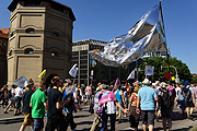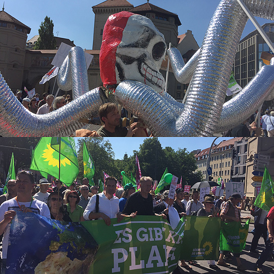 Zwischen 34.000 und 40.000 Teilnehmer hatte die Anti-G7-Demonstration in München am arbeitsfrien 04.06.2015. An diesem heißen Sommertag folgten zahlreiche friedliche Versammlungsteilnehmer einem Aufruf, um in der Münchner Innenstadt an der sich fortbewegenden Versammlung „G7 Wirtschaftsgipfel: TTIP Stoppen, Armut bekämpfen, Klima retten“ zu beteiligen. Eine laute, bunte und vor allem friedliche Demonstration zog vom Stachus bis zum Odeonsplatz, wo die Abschlußkundgebung stattfand. Christoph Bautz, Vorstand der Bürgerbewegung Campact, sieht in der Demo ein klares Signal gegen die geplanten Freihandelsabkommen: “Merkels Plan, mit dem G7-Gipfel TTIP wieder fit zu machen, haben heute viele Tausende Menschen durchkreuzt. Eine breite und bunte Bürgerbewegung streitet dagegen, dass mit TTIP und CETA Konzerne noch mehr Macht erhalten, während unsere Parlamente entmündigt werden. Gemeinsam verteidigen wir unsere Demokratie und unseren Rechtsstaat gegen die Googles und Monsantos dieser Welt. Heute haben wir Bürger den G7-Staatschefs klar gemacht: Mit TTIP und CETA kommt Ihr nicht durch.” Für Hubert Weiger, Landesvorsitzender des BUND Naturschutz in Bayern, muss der G7-Gipfel klare Signale für den Klimaschutz senden: “Statt weiterhin auf Kohle, Atom und Fracking zu setzen, stehen die Industriestaaten in der Verantwortung, konkrete Zusagen zum Ziel 100% Erneuerbare Energien bis 2050 zu verankern. Damit der Klimagipfel in Paris ein Erfolg werden und ein globales Klimaabkommen zustande kommen kann, muss sich gerade Deutschland dafür einsetzen, dass bei der Klimapolitik eine Überprüfung von Zusagen etabliert wird. Besonders vom Klimawandel betroffene Staaten müssen außerdem stärker unterstützt werden.” Angela Müller, Sprecherin der Arbeitsgemeinschaft bäuerliche Landwirtschaft, fordert gemeinsam mit Bäuerinnen und Bauern weltweit eine Politik, die sich an Ernährungssouveränität orientiert und dem Recht auf Nahrung gerecht wird: “Die derzeitige Politik der G7-Staaten dient v.a. den Interessen transnationaler Konzerne und verstärkt Hunger und Armut. Es kann nicht angehen, dass unter dem Deckmantel der Hungerbekämpfung afrikanische Regierungen dazu gezwungen werden, gegen ihre eigenen Bauern vorzugehen. Statt internationalen Konzernen Land zur Verfügung zu stellen und den freien Saatguttausch zu verbieten, müssen die Bäuerinnen und Bauern gestärkt werden! Sie erzeugen nämlich den Großteil der weltweiten Nahrung.” Jörn Kalinski von Oxfam Deutschland zu den Ursachen der extrem ungleichen Verteilung des weltweiten Reichtums: “Die Lücke zwischen Arm und Reich wächst: 2016 wird ein Prozent der Weltbevölkerung genauso viel Vermögen besitzen, wie der Rest der Welt zusammen! Diese Ungleichheit ist das Ergebnis politischer Entscheidungen, verursacht etwa durch eine Steuergesetzgebung, die Steuerflucht und -vermeidung ermöglicht. Wir brauchen eine Reform der internationalen Steuergesetzgebung sowie eine gerechtere Besteuerung des reichsten ein Prozents der Weltbevölkerung und transnationaler Unternehmen.” Uwe Hiksch, Bundesvorstand der NaturFreunde Deutschlands und Anmelder der Demonstration erklärt: “Die Demonstration zeigt überdeutlich, dass die Mehrheit der Menschen die falsche Politik der Regierungschefs ablehnt. Statt für 360 Millionen Euro ein von der Öffentlichkeit abgeschirmtes Treffen in den Bergen zu organisieren, sollten sich die Regierungen der Länder endlich für eine gerechte Weltwirtschaftsordnung einsetzen, in der Rüstungsexporte verboten, Freihandelsabkommen gestoppt und die neokoloniale Ausbeutung der Länder des globalen Südens beendet wird.” Die Veranstalter hatten sich bereits im Vorfeld eindeutig von Gewalt distanziert und damit wesentlich zum friedlichen Verlauf der Versammlung beigetragen. Obwohl es sich um eine der größten Kundgebungen der letzten Jahre in der Landeshauptstadt München gehandelt hat, mussten keine Sicherheitsstörungen verzeichnet werden. Aufgrund der sehr hohen Temperaturen kam es bei einigen Kundgebungsteilnehmern allerdings zu Kreislaufproblemen. Die Polizeiführung entschied deshalb kurzfristig die Feuerwehr um „Amtshilfe“ zu bitten, um die Teilnehmer mit Wasser versorgen zu können. Mehrere tausend Pappbecher wurden eigens von Einsatzkräften der Polizei herbeigeholt. Für diese völlig neue Form des polizeilichen Versammlungsschutzes erhielten die Einsatzkräfte den ausdrücklichen Dank und die besondere Anerkennung vieler Anwesenden. „Ich würde mir sehr wünschen, dass wir diese positive Grundstimmung sowie die vorbildliche Versammlungskultur aller Kundgebungsteilnehmer auch für die anstehenden Tage nach Garmisch- Partenkirchen mitnehmen können“, resümierte der Einsatzleiter, Polizeivizepräsident Robert Kopp. Wir sind uns aber sicher, dass dies die große Mehrheit der Versammlungs-Teilnehmer in München genauso sieht. Aus diesem Grund bitten wir Sie darum:
