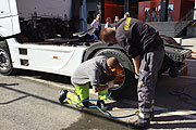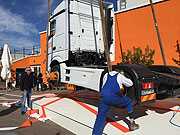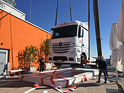 Höhenflug - mit Mercedes-Benz und Fleetboard ging es auf zu neuen Höhen: Spektakuläre Vorbereitungen am MÜNCHEN HOCH5 - eine 7,7 t schwere Mercedes-Benz Actros Zugmaschine flog durch den Münchner Himmel |