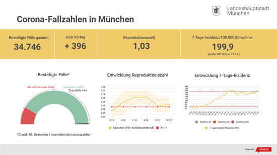 Entwicklung der Coronavirus-Fälle In dieser Zahl enthalten sind 28.492 Personen, die bereits genesen sind, sowie insgesamt 414 Todesfälle. Entsprechend der Handhabung durch das Robert Koch-Institut (RKI) kann der jeweils ausgewiesene Tageswert auch Nachmeldungen für die Vortage enthalten. Der aktuelle Stand der Tages- und Vortageswerte sowie weitere Informationen zur Ermittlung können im Abschnitt „Tageswerte“ unter muenchen.de/coronazahlen abgerufen werden. Der auf dem RKI-Dashboard veröffentlichte Inzidenzwert (corona.rki.de) ist der nach dem Infektionsschutzgesetz und der Bayerischen Infektionsschutzmaßnahmen-Verordnung ausschlaggebende Wert, ob einer der dort festgelegten Inzidenz-Schwellenwerte (35, 50, 200, 300) über- oder unterschritten ist. Das heißt, dass Schwankungen im Rahmen dieses Konfidenzintervalls statistisch gesehen nicht signifikant sind. Für die aktuelle Reproduktionszahl von 1,03 liegt diese Spannbreite zwischen 0,93 und 1,13. Alle offiziellen Informationen der Stadt zur Corona-Situation unter muenchen.de/corona