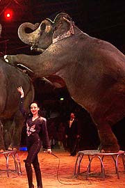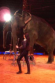 ![]() ©alle Fotos: Martin Schmitz Tierlehrerin Jana Mandana (23. J.) präsentiert die Wappentiere des Circus Krone in einer Choreographie aus Schwergewicht und Anmut. Jana lebt seit ihrer frühen Kindheit in der Krone-Villa und ist so etwas wie eine Ziehtochter der kinderlos gebliebenen Direktorin Christa Sembach-Krone, die im 2. Winterprogramm 2003 keine Nummer vorführt. Janas große Liebe gehört den Elefanten, doch auch mit Pferden beweist sie in einer weiteren Nummer, kann sie hervorragend umgehen. Zurück zum Haupttext: 2. Winterprogramm des Circus Krone vom 1.-28.2.2003 (mehr) |