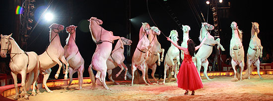Jana Mandana zeigt anschliessend Klassische Hohe Schule in Perfektion. Zu feurigen Klängen wird ein Potpourri der schönen Figuren des Dressurreitens präsentiert. Anspruchsvolle Schrittfolgen kombiniert mit stimmungsvollen Gängen und Touren vereinen sich zu hippologischen Dressurbildern zum Träumen schön.. Jana Mandana - eine glückliche Frau auf einem glücklichen Pferd. Außerdem ein Hippologisches Potpourri edler Hengste zu Melodien aus "Carmen" Die Faszination edler Pferde zeigt sie aufs Vortrefflichste. Wie auf einem Pariser Laufsteg ziehen herrlichfeurige Araber und pastellfarbene Cremellos ihre Keise und werden mit leichter Hand präsentiert In einer "Parade der Schönheit" glänzen sie mit allen schwung-vollen und charmanten Figuren einer klassischen Freiheitsdressur und begeistern mit ihrer Kraft und Eleganz. Die edlen Hengste tanzen im Rhythmus der Musik und stehen für wahre Harmonie zwischen Mensch und Tier. Genießen Sie den prachtvollen Duft der Manegenfreiheit.