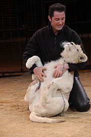 MARTIN LACEY JR. (Großbritannien) hat sich für das März-Programm etwas ganz Besonderes einfallen lassen: Die ersten (Dressur-)Schritte des weißen Babylöwen BALUGA. Hautnah und live können die Zuschauer das Erlernen des Raubtier-ABCs miterleben und das in jeder Vorstellung.