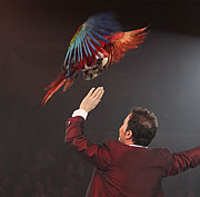 Einmalig aber ist der Freiflug der herrlichen Tiere über den Köpfen der Zuschauer. Papageien als Stars der Manege - Bellissimo (Neu arrangiert).