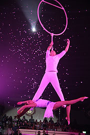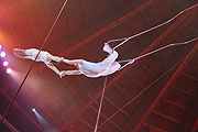 FLYING NIKOLAEVA (Rußland) kommen mit vier fliegenden Menschen unter der Circuskuppel nach München. Wie von Flügeln getragen, schweben drei Flieger und ein Fänger über den Luftraum der Manege. In klassischer Viererbesetzung präsentieren die "Helden der Lüfte" ein Luftballett von Weltformat.