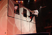 CATWALL ACROBATS (Kanada) präsentieren up-to-date Circus in seiner schönsten Form für die nächste Generation. Sechs Weltklasse-Trampolinspringer aus Montreal haben ihren Sport mit einer gläsernen Haus-Kulisse kombiniert, auf der sie ihre wilden Sprünge zeigen. Sie laufen senkrecht daran hoch, verschwinden darin, erscheinen plötzlich an anderer Stelle, springen einzeln oder synchron hinab und lassen sich wieder hochkatapultieren.