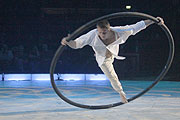 Mit grenzenloser Dynamik dreht, fliegt und schwebt er durch die Manege, zieht Kreise und schwingt durch Zeit und Raum. Und das mit einem Einzelreif, der im Gegensatz zum Rhönrad ohne jegliche Halterung für Hände und Füße auskommt. Rundum perfekt und rundum geglückt. Seine Performance mit dem "Roue Cyr", das von Daniel Cyr, dem Mitbegründer des Cirque Eloise erfunden wurde, gilt als die beste der Welt (Erstmals in München).