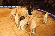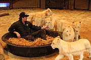In der Manege erleben könenn die Besucher der Vorstellung nun eine Dressurschule der ganz besonderen Art. Unter Ausnutzung ihres Spieltriebes dürfen die Tierkinder täglich in die Raubtierschule gehen und etwas Neues erlernen. In bekannt einfühlsamer Weise zeigt Martin Lacey die ersten Schritte der zukünftigen Superstars im Scheinwerferlicht. Wir hatten vorab schon einmal die Möglichkeit, einen Blick auf die Kleine zu werfen, die mit nun knapp 6 1/2 Monaten schon ein ganzes Stück gewachsen sind, doch nur etwa einem Drittel ihres Gewichtes, wenn sie einmal ausgewachsen sind. Bei diesem allerersten Auftritt musste Martin Lacey selbstmit durch den Tunnel kriechen, so ganz geheuer war den Jungtieren der Käfig noch nicht, in den man ihre Spielzeuge wie Kratzbaum oder Gummiball platziert hatte. Nachdem sich die anfängliche Neugier gelegt hatte, die die vielen fotogafierenden udn filmenden Journalisten am Rande des Käfigs verursachten, konnte Martin Lacey zeigen, dass vieles von dem , was man später beim ausgewachsenen Tier sehen kann, schon von Anfang an veranlagt war. Es geht um viel Vertrauen "Sie kennen mich, ich bin ein komischer Löwe, ich bin akzeptiert. Sie haben keine Angst, und das ist die Hauptsache.", erklärt Martin Lacey jr. "Ich will, daß das Publikum im Februar Programm genau den Anfang sehen kann,: spielen mit den Löwen, den Charakter der Löwen erkennen, was sie gerne machen. Alle Löwen können springen, aber vielleicht springen nicht alle Löwen gerne. Ich sehe das: ein guter Tierlehrer baut auf den Charakter des Löwen. Wenn ein Läwe gerne springt, nutze ich das, und wenn einen nicht springen will, dann machen wir etwas anderes" Grace ist zum Beispiel sehr Der Kartenvorverkauf in München ist täglich von 10.00 bis 18.00 Uhr geöffnet. Der Krone-Zoo mit seinen 250 Tieren ist Sonntags ab 10.00 Uhr geöffnet.