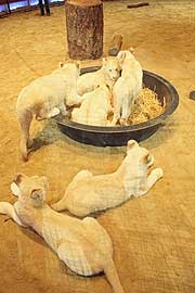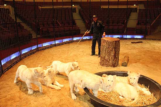 MARTIN LACEY JR. (Großbritannien) präsentiert im zweiten Winterprogramm des Circus Krone, welches am 1.2.2012 Premiere hat, eine echte tierische Sensation: Sechs kleine weiße Löwen geboren Ende Juli 2012 bei einem Gastspiel des Circus Krone in Konstanz. Alle Sechs waren putzmunter und pumperlgesund. Die Geburt dauerte mit Wehen fast acht Stunden. Dann war die Sensation perfekt: Unglaubliche sechs weiße Löwenbabys - So etwas gab es weltweit noch nie. In keinem Circus, keinem Zoo, keinem Park. Die Eltern sind der legendäre weiße Mähnenlöwe King Tonga (10) und die weiße Löwendame Princess (6). Wichtig: Die weißen Löwchen sind keine Albinos, sondern eine sehr seltene, helle Farbvariante mit himmelblauen Augen. Martin Lacey jr. scherzt damit gerne und nennt sie „My little icebears“.