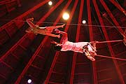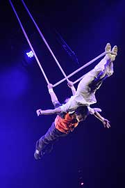 Das Duo Pjöngyang (Nordkorea) beweist mit seiner nagelneuen Strapatenkür wieder einmal die Ausnahmestellung nordkoreanischen Circusschaffens. Erleben Sie einen atemberaubenden „Pas de Deux“ am Boden und in der Luft. Mit immer neuen Schwüngen und Drehungen bezaubert es auf seiner Reise durch Zeit und Raum. Seine Trickfolge begeistert. Sein Stil fasziniert. In einem Rausch aus Farben und Formen präsentiert es vollendeten Kunstgenuß und Ballettromantik im fliegerischen Gewande (Deutschland-Premiere). |