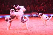 Doch wer führt hier eigentlich wen vor ? Mit viel Schalk hinter der Pfote, beweisen die Bellkünstler, daß sie mehr draufhaben als „Männchenmachen“ oder „Stöckchenholen“. Die Manegenprofis auf vier Pfoten glänzen mit Flegelstufe 8 in einer artistischen Sprung-, Roll- und Laufkür. Mit sicherem Gespür für Gags sorgt die kreuz und quer gemixte Künstlertruppe für 10 Minuten gebellte Unterhaltung. Nur eine stiehlt zu guter Letzt noch allen die Show: MAJA, der Witzbold der Hundemeute. (Neu arrangiert für München). |