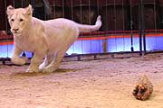 Weltklasse-Schauspielerin Veronica Ferres in einer ungewohnten Rolle: Die bekennende Tier- und Circusfreundin übernahm die Patenschaft für das schneeweiße Löwenkind Alba. Sie ließ sich ihre Nervosität gegenüber dem Löwen (acht Monate alt, 50cm lang, verspielt und verschmust) nicht anmerken. Doch als sie zwischendurch und am Schluss die Manege verließ, war ihr die Erleichterung deutlich anzusehen. Das bildhübsche Löwenmädchen wurde 2012 bei einem Krone-Gastspiel in Konstanz geboren. Eine tierische Sensation, bei der gleich fünf weitere Löwenbabys das Licht der Welt erblickten. Solch ein Ereignis gab es Weltweit noch nie - in keinem Zoo, Safaripark oder Circus. Die Eltern der Löwenkinder sind der weiße Mähnenlöwe King Tonga (10) und die weiße Löwendame Princess (6). Alle zwei Stunden hatten die putzigen Löwenbabys Hunger, was dazu führte dass die Mutter mit nur vier Zitzen rund um die Uhr beschäftigt war. Daher wurde sie von dem Tierlehrer Martin Lacey jr. mit der Milchflasche unterstützt. Dieser freut sich sehr über die Gesundheit und Munterkeit aller sechs Tiere. Er sagt von sich, für sie sei er „der verrückte andere Löwe“.