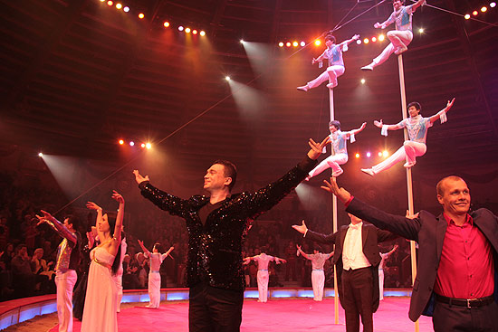 Die Freundin Julia C. (25) sagte dann auch "Ja", und mit den GlücksbringernRingmeister Nokolai Tovarich und Clown Pierino kann eigentlich nichts schiefgehen, denn die Glückwünsche eines Clown bringen 88 Jahre Glück, vor allem wenn sie mit einem Schyzer Örgeli begleitet werden.... Ganz besonders stolz aber ist man auf ein Wiedersehen mit einem guten Bekannten der Münchner Circusfreunde, der nach 14 Jahren wieder den „Löwenanteil“ des Programmes bestreiten wird: Der zauberhafte Clown Pierino. Nicht den lauten, den leisen Sensationen gehört sein Interesse und er wird zusammen mit Partnerin Olga die Krone-Manege gekonnt mit Poesie und Phantasie, Zauber und Zärtlichkeit füllen. Bevor sich der Circus Krone nun für 7 1/2 Monate von München verabschieden und auf die große Reise durch Deutschland geht (erste Station über Ostern wird Landshut sein, von 10.-22. April 2014), möchte man hier im Münchner Circus Krone Bau „indoor“ noch einmal verzaubern und überraschen. 37 Tage voller Circusvergnügen bieten ein Festival-Programm, das seinem Namen alle Ehre macht. Pierino und Olga (Schweiz, Rußland) sind wahre „Juwelen des Humors“. Pierino, der zauberhafte Clown begeisterte Sie schon mehrfach und wurde hier zum absoluten Star im Roten Ring. Zusammen mit Partnerin Olga wird er Sie nun mit neuen Clownerien und Szenerien verwöhnen. Sein Motto lautet Freude. Nicht nur Lachen will er Ihnen bringen, sondern auch die Phantasie beflügeln. Kurzum, wer Herzenswärme, Charme und feine Circuspoesie sucht, ist bei ihm an der richtigen Adresse. Mit hintergründigem Witz und subtiler Sentimentalität schenkt der er Welt Auftritte voller Zärtlichkeit und Phantasie. Gekonnt zaubert er ein Lächeln in die Herzen der Besucher. Freuen Sie sich auf einen brillanten Mix aus Artistik, Kunst und visuellem Theater, eingebettet in eine Welt aus Musik, Tanz und Humor. Natürlich mit speziell designeten Kostümen und Requisiten. (Neue Ideen für München). Jana Mandana (Sembach-Krone) präsentiert hohe Reitkunst in Vollendung auf dem kraftvollen Friesen ODIN und dem prachtvollen Lusitano-Hengst RAMSES. Ein Potpourri der herrlichsten Figuren des klassischen Dressurreitens wie Piaffe, Passage, Spanischen Schritt oder Fliegende Galoppwechsel. In anspruchsvollen Schrittfolgen zaubert sie alle Touren und Gänge der Hohen Schule ins Sägemehl und performt Huf an Huf ein hippologisches Highlight im Rhythmus der Musik. Ideenreiche Dressurfolge, Originalität und hohes reiterliches Können zeichnen sie aus. Genießen Sie die einmalige Magie zwischen Pferd und Reiter in einer strahlenden Symphonie der Hohen Schule (Neu arrangiert für München). Crazy Wilson (Kolumbien) steht für Adrenalin am Todesrad. Sein zweiter Vorname lautet „Gefahr“. Wilson Dominguez ist in der Luft zuhause und fürchtet die Schwerkraft nicht. Hart am Herzschlag sorgt er am rotierenden Riesenrad für Hochspannung und Nervenkitzel pur. Kein Trick in luftiger Höhe ist ihm zu schwierig oder ausgefallen, um nicht mit dem Entsetzen des Publikums jonglieren zu können. Mit atemberaubender Geschwindigkeit fliegt er um die eigener Achse, dreht Loopings und bietet eine luftige Sensation nach der anderen. Bei seinen halsbrecherischen Stunts fiebert sogar die Manege mit. Und sein einmaliger Salto bei 120 km/h im wilden Flug setzt dem Nervenkitzel den i-Punkt auf. Wetten, daß sein Schutzengel täglich Überstunden macht ? (Neu arrangiert für München / Mit UV-Effekten !). Duo Minasov (Rußland) zeigt die schnellste Modenschau der Welt: 14 Kostüme in weniger als fünf Minuten ! Zwei Magier der Mode geben sich die Ehre und beantworten die wohl am häufigsten gestellte Frage: „Wieso finden Frauen nie das Richtige zum Anziehen?“ in zauberhafter Weise. Im Sekundentakt wechseln Elena und Victor Minasov ihre Roben. Röcke werden zu Kleidern, Rot zu Blau. Mit blitzschneller Perfektion und tänzerischer Eleganz machen sie das Unfaßbare wahr und geben dem Publikum Rätsel auf und das in einer rundum einsehbaren Manege schneller als das menschliche Auge. Gewußt wie ! (Neu für München). James Puydebois (Frankreich) präsentiert leicht-und schwergewichtige Bollywood- Tänzerinnen und verspricht klassische Circuskunst auf gigantischem Niveau. Drei prächtige Dickhäuter bringen die unverwechselbare Circusluft in die Manege und erobern mit viel Rüsselspitzengefühl den Roten Ring. Sie überraschen als Balance-Künstler, bilden Pyramiden und glänzen in Tänzen „Out of Bollywood“. Ihre Elefanten-Ballade ist ein Loblied auf die Rüssel-Riesen mit vielen beeindruckenden Gruppenbildern und Tempiwechsel. Mit neuem Kopfputz glänzen sie förmlich vor Können und Charisma und tragen ihre „Haremsdamen“ Jana, Clara und Malena mit sichtlichem Stolz durchs Sägemehl. Cirque elefantastique ! (Neu arrangiert für München). Martin Lacey Jr. (Großbritannien) kommt mit der größten Löwengruppe der Welt nach München. Wie ein Künstler von einem anderen Stern präsentiert er seine gold-und silbergeadelten Raubkatzen als große Stars im Zentralkäfig und läßt sie höchst effektvoll fauchen und drohen. Die zwölf bildschönen Löwendamen offerieren ihre Zähne, ihre Pranken und ihre wilden Kunststücke mit viel Show-Appeal und grenzenloser Dynamik. Der grandiose Dompteur zeigt seine Schützlinge als große Kämpfernaturen im Spannungsfeld zwischen Biss und Bewunderung. Andressierte Scheinangriffe wechseln ab mit weiten Sprüngen und dem Austausch von Zärtlichkeiten. Pyramide, Löwenbar und ein lebender Teppich folgen. Der hochdekorierte Löwenheld liebt das Risiko und mag Geschwindigkeit, Rasanz und Thrill ohne Ende. Ohne Vertrauen geht das nicht. Ein Wunderwerk der Dressur ist auch Mähnenlöwe KASANGA, der sich als Pascha im Reich der weißen und goldfarbenen Großkatzen so richtig wohl fühlt und der einzigartige weiße Löwe KING TONGA als „Traum in Weiß“. (Neu choreographiert für München). Die Quing Dao-Truppe (China) gehört zu den be