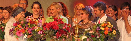 Die Bayerischen Landesmeisterschaften der Floristen für die Silberne Rose 2005, durchgeführt und organisiert vom Fachverband deutscher Floristen (FDF), fanden am 2. Juli 2005 im Kulturforum auf der Bundesgartenschau statt. Und wie immer, wenn Floristen einen Wettbewerb austragen, standen Blumen und Kunst im Vordergrund. 10 Teilnehmer traten gegeneinander an und mussten fünf verschiedene Aufgaben bearbeiten. Letzten Endes war Simone Klose vom Bezirksverband Oberfranken strahlende Siegerin der Silbernen Rose 2005. Sie behauptete sich gegen ihre männliche Konkurrenz Rainer Böhm und Markus Pommer, die die Plätze Zwei und Drei erreichten. Die Schirmherrin der Veranstaltung, Frau Prof. Susanne Porsche, äußerte sich respektvoll und voller Bewunderung über die Leistung der teilnehmenden Floristen. Der kurzweilige Abend wurde von Frau Anna Lindner, Floristin aus München und bekannt aus Funk und Fernsehen, moderiert und von den Piano Sisters musikalisch begleitet. Zwei Werkstücke, eine Tischdekoration zur Feier eines runden Geburtstages und ein Floraler Kranz der Freude, in enger Verbindung zur „Nacht der Solidarität“, fertigten die Floristen bereits am Nachmittag. Drei weitere Aufgaben bearbeiteten sie live vor dem interessierten Publikum: Einen Geschenkstrauß zur Geburt, einen Brautschmuck, den floralen Höhepunkt des Abends, und schließlich eine Überraschungsarbeit voller Urlaubs- und Partystimmung. Die für diese Überraschungs-Arbeit benötigten pflanzlichen und nicht pflanzlichen Werkstoffe und Gefäße wurden komplett vom Veranstalter zur Verfpgunggestellt. Es bestand keine Verpflichtung, alle zur Verfügung stehenden Werkstoffe zu verwenden. Es durften auch keine selbt mitgebrachten Werkstoffe zu verwenden. Es durften auch keine selbst mitgebrachten Werkstiffe zugefügt werden. Die Zuschauer verfolgten interessiert den Ablauf auf der Bühne und feuerten ihre Favoriten eifrig an. Bei der Präsentation des Brautschmucks nahm das Klatschen kein Ende mehr. Die Teilnehmer am Wettbewerb um die Silberne Rose waren: Marion Wenzel, Stefanie Kießling, Andeas Müssig, Sabrina Tafreschi, Markus Pommer, Eva Hassenkamp, Eva Eigenberger-Stangl, Alexandra Höfer, Simone Klose und Rainer Böhm. Wir haben für sie eine umfangreiche Fotogalerie mit Bildern von den ausgestellten Sträussen und der Brautmodenschau am Sonntag, 3.7.2005, Teil 1, 2, 3. - Bundesgartenschau 2005 - Das Special (mehr) Freizeitparks: - Startseite Special Bavaria Filmstadt Geiselgasteig (mehr) - Hier geht es zu den Seiten für Ideen für Freizeit mit Kindern (weiter) |