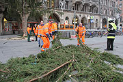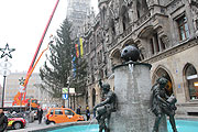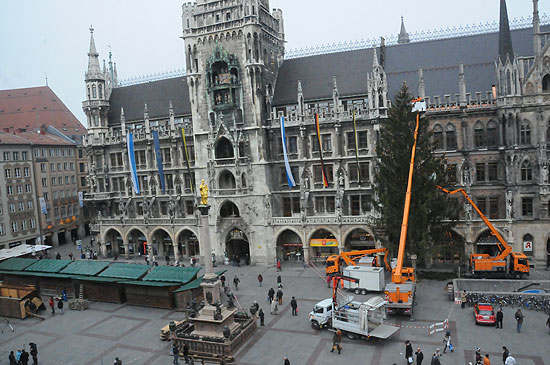 Gegen 5.45 Uhr traf am 14.11.2011 aus Aschau im Zillertal (www.aschauimzillertal.at) kommend der diesjährige Weihnachtsbaum für den Christkindmarkt am Marienplatz ein, ein problemloses, etwa 4,5 Tonnen schweres Exemplar, das von der die Münchner Berufsfeuerwehr mit schwerem Gerät in die Lüfte gehoben und an seinen künftigen Standort platziert wurde. Zahlreiche Fichtenzapfen hängen noch an seinen Ästen, er wurde im unteren Teil auch noch vom Umfang mit Motorsägen ein wenig auf 25 m Länge gekürzt, einige der unteren Zweige gekappt, die zu tief hingen, und eine Tafel mit dem Namen der Spendergemeinde wurde angebracht.