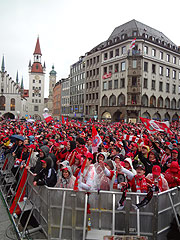 Als Abschluss durfte sich die Mannschaft ins Goldene Buch der Stadt München eintragen, der FC Bayern München sei die "Krone des Fußballs", lobte Oberbürgermister Christian Ude die Mannschaft auf dem Balkon in seiner ganz kurz gehaltenen Ansprache. Übrigens: einen Blick auf den Marienplatz gestattete den ganzen Tag bereits die Webcam vom Ludwig Beck aus die auch zeigt, das der Baustellenbereich um den Fischbrunnen herum komplett abgesperrt ist, wodurch es sicher noch viel enger auf dem Marienplatz zugehen wird. Um 13.30 Uhr hielt sich allerdings die Anzahl der Fans unter Regenschirmen noch sehr in Grenzen....