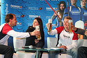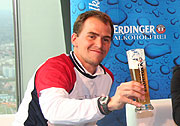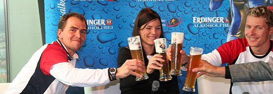Auf 181 Meter Höhe im Münchner Olympiaturm stellte die Privatbrauerei ERDINGER Weißbräu Ende Oktober 2008 ihre neue Partnerschaft mit der Internationalen Biathlon Union (IBU, www.biathlonworld.com) vor. Als zuständiger Weltverband für den Biathlonsport vertritt die IBU die meisten Belange des Biathlonsports im internationalen Bereich nach außen und ist ein Internationaler Olympischer Wintersport Verband mit 66 Mitgliedsverbänden.. Die Privatbrauerei wird ihr EDINGER Alkoholfrei in den Mittelpunkt der Werbeaktivitäten stellen. Auf allen Weltcuprennen und der Weltmeisterschaft sorgt der isotonische Durstlöscher für die nötige Regeneration der Stars. Der Präsident des Deutschen Skiverbandes und Vizepräsident der IBU, Alfons Hörmann, freut sich auf „einen starken und zuverlässigen Partner, der perfekt zum deutschen und internationalen Biathlonsport passt.“ „Wir werden Biathlon, die Wintersportart Nummer Eins in Deutschland, untrennbar mit unserer Brauerei und ERDINGER Alkoholfrei verbinden“, so Josef Westermeier, Geschäftsführer Marketing & Vertrieb der Brauerei. Das Logo auf den Startnummern und beste Bandenplätze garantieren eine geballte TV-Präsenz. Ein Presenting bei ARD und ZDF, klassische Spots im Biathlon-Umfeld und eine Anzeigenkampagne runden den aufmerksamkeitsstarken Auftritt optimal ab. Die Spitzenbiathleten des Team ERDINGER Alkoholfrei (www.team-erdinger-alkoholfrei.de), Michi Greis (www.michael-greis.de), dreifacher Olympiasieger, Vizeweltmeister Andi Birnbacher (www.andi-birnbacher.de) und Weltcupsiegerin Kathrin Hitzer (www.kathrin-hitzer.de) werden in einer spektakulären Hero-Kampagne in Szene gesetzt. Dementsprechend wurde die Teilnehmer der Pressekonferenz von lebensgroßen Figuren in futuristischen Anzügen alla Supermann empfangen. Die lebensechten Pendants erzählten von den aufregenden Fotoshootings und Filmaufnahmen zur neuen Kampagne. Daneben wurde Überraschendes vom neuen Dream-Team des deutschen Biathlon vermeldet. Der Koch im Hause Hitzer-Greis heißt Michi! Keine Sorgen muss sich Andi Birnbacher machen. Sein Kumpel Michi Greis wird weiter mit ihm auf dem Doppelzimmer nächtigen und nicht zur neuen Freundin umziehen. „Des klappt auch so mit der Kathrin,“ meinte der Superstar der letzten olympischen Winterspiele. Zu den Trainingsdifferenzen mit dem Bundestrainer Frank Ullrich sagte Michi Greis: „An unserem Trainingsprogramm hat sich überhaupt nichts geändert. Lediglich an den Lehrgängen von Bundestrainer Ullrich beteiligen sich die Ruhpoldinger Athleten nicht.“ Auch der internationale Anspruch der Brauerei aus dem oberbayerischen Erding kommt nicht zu kurz. Der Weltcup-Zirkus macht Halt in Schweden (Östersund, 03.12. - 07.12.2008), Österreich (Hochfilzen, 11.12. - 14.12.2008, 18.12. - 21.12.2008), Italien (Antholz, 22.01. - 25.01.2009), Kanada (Vancouver, 12.03. - 15.03.2009), Norwegen (Trondheim, 19.03. - 22.03.2009) und Russland (Khanty Mansyisk, 26.03. - 29.03.2009). Die Biathlon Weltmeisterschaften finden 2009 in Süd Korea (Pyeong Chang, 12.02. - 22.02.2009) statt. Genug Gelegenheiten vor Ort für den Botschafter bayerischer Lebensfreude und Gastlichkeit seine bestehenden Kundenbeziehungen zu festigen und neue Freunde dazu zu gewinnen. Nicht umsonst gilt ERDINGER Weißbier auch im Ausland als das beliebteste Weißbier. |