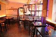 Eine riesige Theke bildete den Mittelpunkt des Lokales, umrahmt von Gegenständen eines ehemaligen Wasserwerkes. Rohre, Pumpen, Messgeräte und viel Metall.