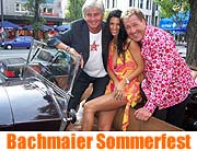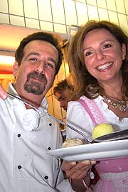 am frühen Abend des 6.4.2005 öffneten er und seine seinerzeitige Geschäftsführerin Tanja Winkler auf der Leopoldstraße in den Räumen des Ex-Leopold neben dem Roxy mit dem Bachmaier Hofbräu ein ungewöhnlich bayerisches Restaurant Konzept. Ein erster Blick in die Räume zeigt, hier wird es die Nachbarschaft nicht mehr so leicht haben wie vorher, als das etwas in die Jahre gekommene Leopold wie ein Relikt der Vergangenheit die Lücke zwischen Roxy und Eiscafe mehr schlecht als recht füllte. Die Zeiten, dass man hier jedermann auf Anhieb auch im Rudel Platz finden konnte, sind demnach künftig vorbei. Dies zu den "schlechten" Nachrichten. Kommen wir zu den guten Nachrichten: es erwartet den Gast im linken vorderen Eingangsbereich u.a. eine stylische Lounge mit gemütlichen Ledersesseln und Hockern, Kerzen auf den niedrigen Tischen, der Blick nach draussen gibt bestens Übersicht über das Kommen und Gehen auf dem Boulevard, ein Standuhr in der Ecke zeigt, wem die Stunde schlägt. Ein Wirtshausbereich führt zur neugeschaffenen, weinrot mit Gold umrahmten hellen und gut gefüllten Bar mit Blick übers Geschehen, schließlich gibt es noch einen behaglichen Restaurantteil im hinteren Bereich des L-förmig geschnittenen Lokales. Ein Konzertflügel schloß seinerzeit noch den Restaurantteil ab, dahinter ein wandfüllender Spiegel, durch den das Tageslicht verstärkt ins Lokal fällt. Den Sommer auf der Sonnenseite von Münchens Flaniermeile verschönert das Bachmaier Hofbräu seinen Gästen mit einer weiteren Besonderheit: Überdachte Logen für je sechs Personen, die je nach Bedarf und Anlass auf jeder beliebigen Seite des Gebäudes positioniert werden können, sowie 150 Freiplätze laden zum gemütlichen verweilen ein. Zur Eröffnung am Abend des 19. 04.2005 kam "tout Munich", um das Motto "Gut essen, g'scheid feiern" auszuprobieren. Hofbräu Chef Dr. Michael Möller, Modequeen Susanne Wiebe (hat ihr Geschäft gleich ums Eck) , die Entertainerin Gloria Gray (mit was! für einem Ausschnitt im Korsett-Dirndl), Schauspielerin Katarina Jacob, Regisseur Otto Retzer, FC Bayern Fußballer Thorsten Fink, Ex-Löwenchef Karl-Heinz Wildmoser, Star Friseur Wolfgang Lippert, Thommy Fuchsberger, Modedesignerin Lola Paltinger, Moderatorin Eva Grünbauer (läuft am 21.4. bei HVB BKK Hypo Lauftreff vorneweg), PR-Lady Annette Zierer (hatte für eine interessante Gästeliste gesorgt), Giulia Siegel (von der im Bachmaier Hofbräu die Idee für eine Suppe aus der Speisekarte stammt), Oliver Kahn Freundin Verena Kerth. ohne Oliver, Brillen-Designer Tomi Suchy, Rock-DJ Armand Presser, BLM Chef Prof. Dr. Wolf-Dieter Ring mit Frau Sylvia Henke, Sänger, Moderator und Ex-Narrhalla Faschingsprinz Ali Kahn, L-Bar in der Wurzererstraße Chef Wolfi Kornemann, Gastronomie Report Herausgeber Willi Faber, Moderatorin Uschi Dämmrich von Luttitz in fescher Tracht ließ sich von Küchenchef Albert Schlesinger die Küche zeigen, die Wirtskollegen Gunter Steinberg (Hofbräukeller am Wiener Platz), Putzi Holena (Paulaner im Tal), Martin Kolonko und Florian Oberndorfer (Wirtshaus zur Brezn 200 m weiter auf der Leopoldstraße), Nürnberger Bratwurst Glöckl und Thaifoon Chef Michael Beck und Tortenkönig Bodo Müller kamen etwas später am Abend, und und und...