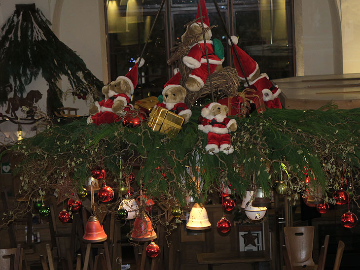 Zwei Nächte lang haben Stefan Rainer, Florist vom Viktualienmarkt, und seine sieben Helfer und Helferinnen gewerkelt: Schließlich galt es, den gesamten hübschen Inhalt von 30 Kisten, meist auf Leitern stehend, dekorativ im Wirtshaus anzubringen. Nun erstrahlt der beliebte „Pschorr“ von Wirt Jürgen Lochbihler in (vor)weihnachtlichem Glanz: Zu sehen gibt es im Parade-Wirtshaus am Viktualienmarkt nicht nur unzählige große Kugeln und Glocken, sondern inmitten von viel Tannengrün auch Pinguine über der Schänke oder Plüschbären im Nikolausgewand. Diese bevölkern einen der großen Lüster im Lokal und erfreuen nicht nur die kleinen Gäste.