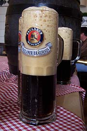 Eines der absoluten Highlights ist sicherlich das im November 2004 vorgestellte schwarze Kapuziner. Der Name ist leicht erklärt: erstens ist das Bräuhaus am Kapuzinerplatz und zweitens ähnelt das fast schwarze Bier mit heller Schaukrone an die traditionelle Tracht der Kapuziner-Mönche. Beim "Schwarzen Kapuziner" handelt es sich um ein untergräriges Bier, das nach altmünchner Brautradition gebraut wird. Münchner Bier war bis Ende des 19. Jahrhunderts immer Dunkles Bier! Das "Münchner Dunkel" ist damit die ur-bayerische Variante eines Lagers. Mit dem Brauen des "Schwarzen Kapuziners" nahm das Paulaner Bräuhaus die Jahrhunderte alte Tradition des Münchner Dunkels wieder auf und schenkt das Bier naturbelassen und unfitriert aus - was einen unverwechselbaren, sehr süffigen runden Geschmack mit einer leichten malzigen Note ergibt. Die Stammwürze beträgt 12,9% und der Alkoholgehlt 5,5 Vol. %. OB Double Uli Bauer, bereits jetzt schon in ersten Vorbereitungen für das Derbleck'n im kommenden Jahr, übernahm bei der Vorstellung des Bieres persönlich das Anzapfen. Begeistert vom Schwarzen Kapuziner zeigten sich dann auch Wirte-Legende Richard Süßmeier, KVR Chef Blume-Beyerle und auch Spöckmeier Wirt Karl Langegger, die wie die Oberen der Paulaner Brauerei zur ersten Bierprobe kamen. "Dunkles Bier ist gut fürs Herz!" (Zitat aus der "Ärztezeitung" vom 17.11.2003): "...Forscher der Wisconsin University in Madison, USA, haben in einer Studie herausgefunden, dass täglich ein großes Glas Dunkles Bier gut fürs Herz ist. Ursache für diesen positiven Effekt ist der hohe Anteil von Polyphenolen, der im DunklenBier bis zu dreimal soch hoch sei, wie im hellen Bier.." Na dann: Prost. -Baustellenbesuch Paulaner Bräuhaus am Kapuzinerplatz: das Traditionshaus mit hausgemachtem Bier wird Mitte Juni 2013 wiedergeöfnet mit neuem Wirt Hermann Zimmerer (mehr) - Paulaner Bräuhaus am Kapuzinerplatz (weiter) Paulaner Bräuhaus München |