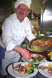 Adriano Antichi legte als Koch und Wirt Wert auf frische und hochwertige Zutaten für seine Speisen und Soßen. Auf der täglich wechselnden Mittagskarte fanden sich italienische Gerichte ab 4,50€. Reichhaltig war die Auswahl von Antipasti, Pizzen, hausgemachten Pastagerichten, Fisch und Fleischspeisen sowie zahlreiche Wildspezialitäten. Überall im Lokal kündeten mit Kreide beschriebene Wandtafeln von den im Angebot befindlichen Tagesgerichten, 34 Sorten Pizza zählte die Speisekarte auf, von der Margherita mit 4,50€ bis zur Pizza Crudo mit Culatello und Ruccola belegt zu 8€ reichte preislich das Spektrum. Pasta Fresca Fatta in Casa hausgemachte frische Pasta ist der Stolz der Küche, Lasagne gab es hier zu 6€, dito die Cannelloni. Pesce Fisch also bot die Karte reichlich: Calemari Griglia (9,50€) oder Orata (11,50€), oder gleich die Specialita della Casa, die Spezialität des Hauses, einen in Salzmantel gebackenen Branzino al Sale für 2 Personen zu 33€ gilt es zu empfehlen. Fleischgerichte und vor allem auch Wild wie Rehgulasch 5,80€ oder Wildschwein Medaillon 9,80€ gab es ebenfalls in großer Auswahl. Schön und ausführlich wurden in der Karte die Weine präsentiert samt Fotos der zugehörigen Flaschen und Beschreibungen, doch genauso die Sinne anregend ist der Blick auf die Flaschen im Original durch die Glastür des Wein-Temperierschrankes an der Stirnseite des Lokales. Offene Hausweine gab es ab 1,50€ je 0,1 l Glas. Zum Ausschank kamen Bierspezialitäten der Spaten Brauerei, 0,5 l Spaten Hell oder Franziskaner zu 2,50€ ließe hier das Bier so richtig schmecken. Alle Gerichte gab es auch zum mitnehmen, der eilige Gast fand im Eingangsbereich einen Schnellimbiss mit Stehtischen, an denen er seine Pizza oder auch Enten- und Hähnchenportionen vom Grill verzehren konnte. Im Herbst 2005 schloß das Ciao leider wieder, inzwischen ist an gleichem Ort ein anderes italienisches Lokal zu finden. - chiao - das Ambiente (mehr) - Lokale von A - Z (die ganze Liste hier bisher vorgestellter Lokale) |