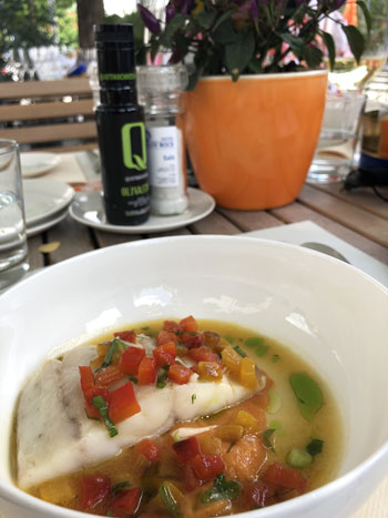 Wie z.B. ein frisch gezapftes Augustiner Bier, oder einen bzw mehrere der Weine aus Deutschland, Österreich, Italien oder Frankreich. In diesem Sommer erwartet die Gäste des Restaurants eine großzügige Außenfläche für 60 Personen unter schattigen Markisen und Schirmen, teils auch unter schattigen Bäumen. Vegetarier können das Menü in einer Fleisch- und Fischlosen Variante bestellen. Aufgetischt wird das Menü Dienstag bis Samstag ab 18.30 Uhr Das Angebot wird gut angenommen, zeigen die ersten Tage. Rechtzeitige Reservierung ist wegen der begrenzten Plätze dringend empfohlen.