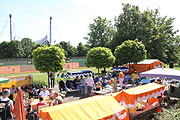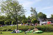 Zum „Friends Opening“ der ganz besonderen Art lud er am Sonntag, 29. Mai 2011. Zwar tauchte der bestellte Bus nicht auf , doch mit Reiseleiter Armin Stegbauer und bezaubernden Stewardessen ging es alternativ dann eben per U-Bahn (und Taxi) bis zum München `72 Park im Olympiagelände. Dort hatten sich u.a. auch Klaus Wolfermann, Sperrwurf-Olympiasieger von 1972, und Langstreckenläufer Günther Zahn, der als Schlussläufer des Fackellaufs 1972 im Olympiastadion das Olympische Feuer entzündete, bereits unter die Gäste gemischt, die hier bei bestem Sommerwetter am Vorabend des offiziellen Sommeranfangs mit gutem Sound, kühlen Getränken und leckeren Grillspezialitäten unter den bunt leuchtenden Lampions bis in die späten Abendstunden feiern. München '72 Park ist wie das München '72 Isar ganz auf Retro eingerichtet, der an den kleinen Kiosktresen anschließende Raum ist mit ledernen Turnkasten-Bezügen tapeziert, eine Radiotruhe aus den 70ern steht in der Ecke, am Tresen mit seinen deckenhohen Kühlschränken gibt es neben alkoholfreien Fritz Kola und Limo Getränken, Almduldler, Karamalz, Ingwerwasser, Milchshakes und diversen erfrischenden Schorlen auch alkoholisches wie Tegernseer Hell (2,90€), Schneider Weisse, Pilsener Urquell, Weinschorle, Sprizz und auch diverses gibt, was man hier verzehren kann. So warten draußen Grills auf die Grillfreunde, Grillwürste oder Putensteaks kann man sich gleich hier besorgen, man darf aber auch eigenes Grillfleisch mitbringen, dann kostet es pro Person 3,50 € eben Tellergeld. Nebenan spielt man auf 22 Tennisplätzen wie schon seit eh und je, nicht nur die Mitglieder und Studenten der Hochschulsportanlage (www.zhs-muenchen.de) und des Studentendorfes gleich in Sichtweite, sondern jedermann kann hier spielen, seit 15 Jahren kann man sich in der zu Steffi Graf Zeiten noch hoffnungsvoll überlaufenen Anlage auch als Nicht-Student vereinsfrei Plätze reservieren lassen. Neben den Sportlern und Studenten sind aber auch andere Gäste willkommen. Studenten der Münchner Fakultät lockt man mit 20% Rabatt auf Speisen und Getränke, das Free WLAN gibt es aber für alle. Die Terrasse der „Sommerresidenz“, die nur bis Oktober geöffnet haben wird, ist mit bunten Hollywoodschaukeln, Retro-Campingstühlen, einem Kicker und einem Tischtennis-Tisch ausgestattet, rudn um den Kisok ist die Terrasse auch überdacht, so dass man auch bei waremn, aber nassem Wetter noch draussen sitzen könnte. Und wenn es heiß ist, gibt’s auch ein kleines Platschbecken. Mal eine ganze andere Terrasse in München, geöffnet hat man Mo.-Do. hier von 09.00 Uhr bis Mitternacht, Fr. & Sa. bis 01 Uhr, Sonntags ab 10 Uhr bis 22.00 Uhr Ach ja, und am Wochenende gibt es hier ein kleines, aber feines Frühstücksbuffet, preisen die Retro Steckbuchstaben an der Wand an. "Wir machen Euch glücklich", steht gleich daneben, ein Versprechen, dass zumindest beim Friends Opening gehalten wurde. Aktuell geplant sind noch ein paar "Retro Tennis Events", doch schon gibt es Terminprobleme, weil so viele schon wegen Geburtstagsfeiern am Wochenenden angefragt haben. Text: Martin Schmitz Video: Impressionen München '72 Isar 29.05.2011 beim Europäischen Patentamt