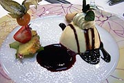 - Crepe Normandie mit Äpfeln, Rosinen, Nüssen, gefüllt mit Karamelsoße, 4,20 Euro